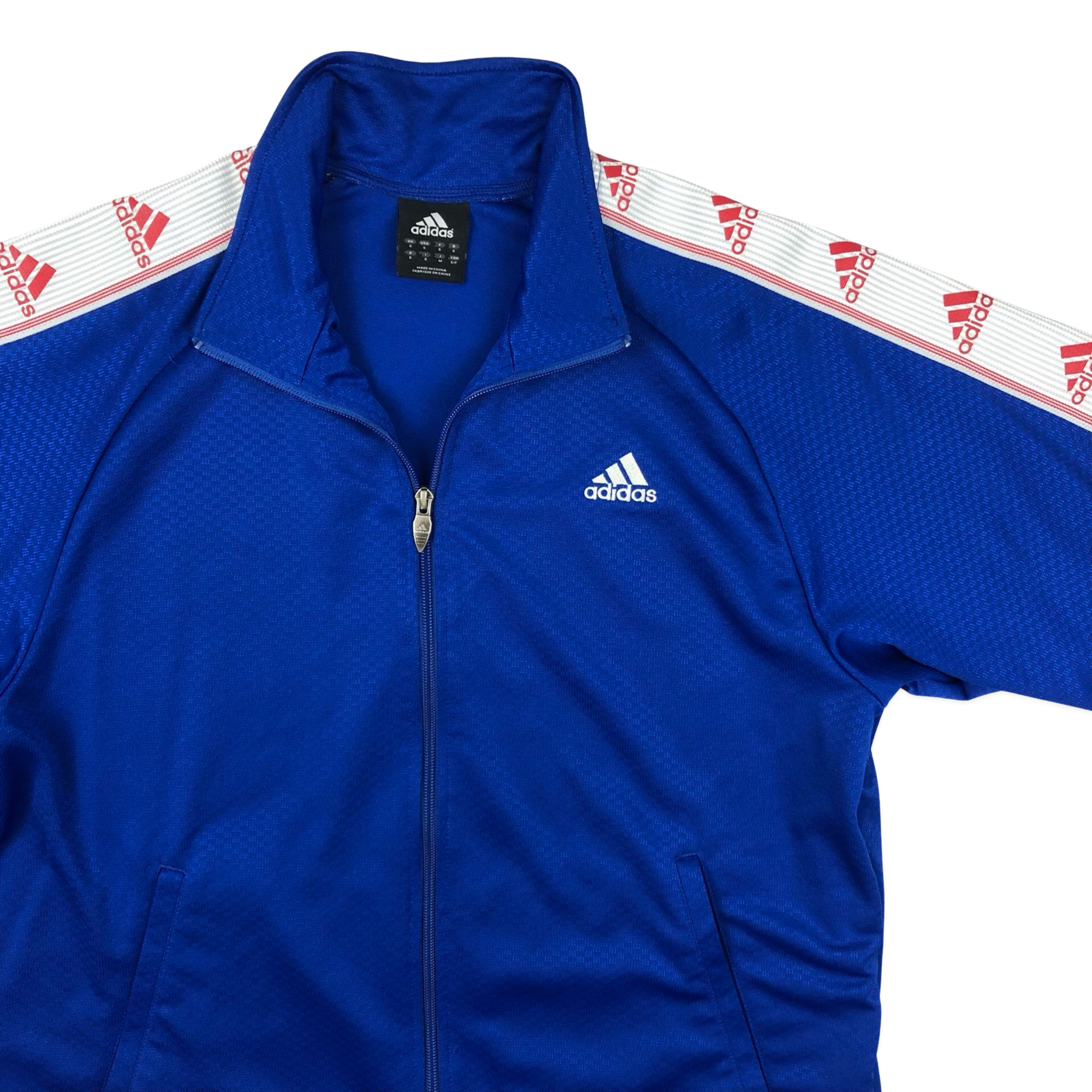 Vintage 2006 Adidas blue track jacket with white ribbon along sleeves and shoulders with repeated Adidas logo in red..