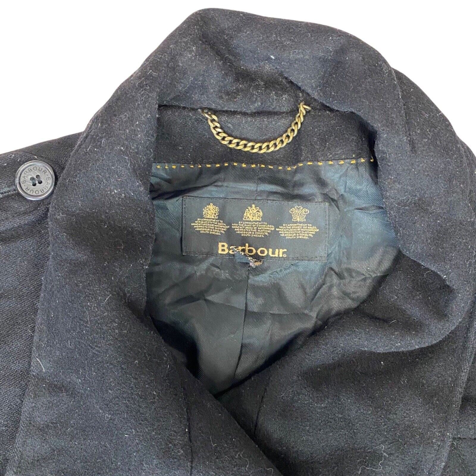 This is a lovely vintage Barbour coat made from a thick, twill weave, black wool fabric with soft lining throughout.