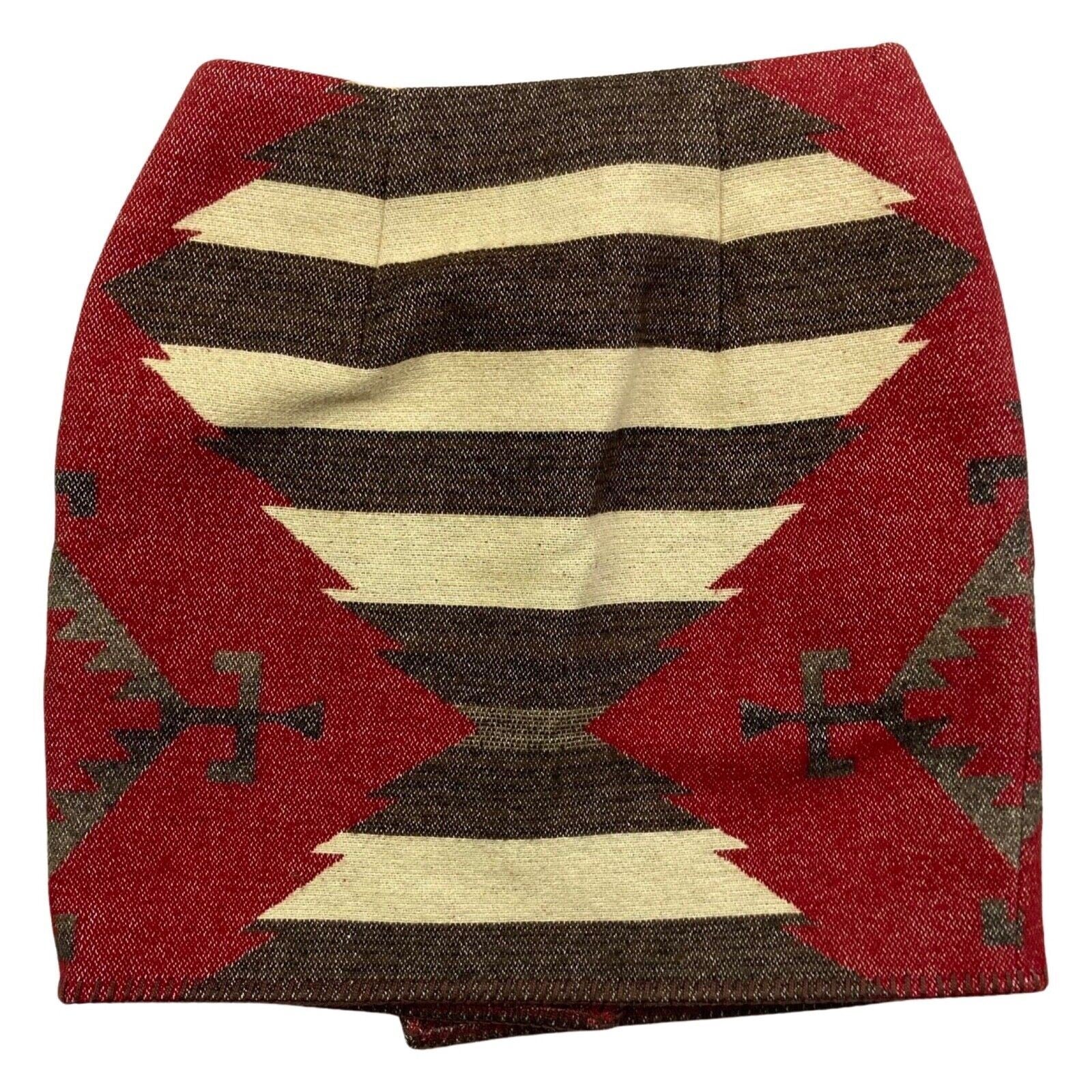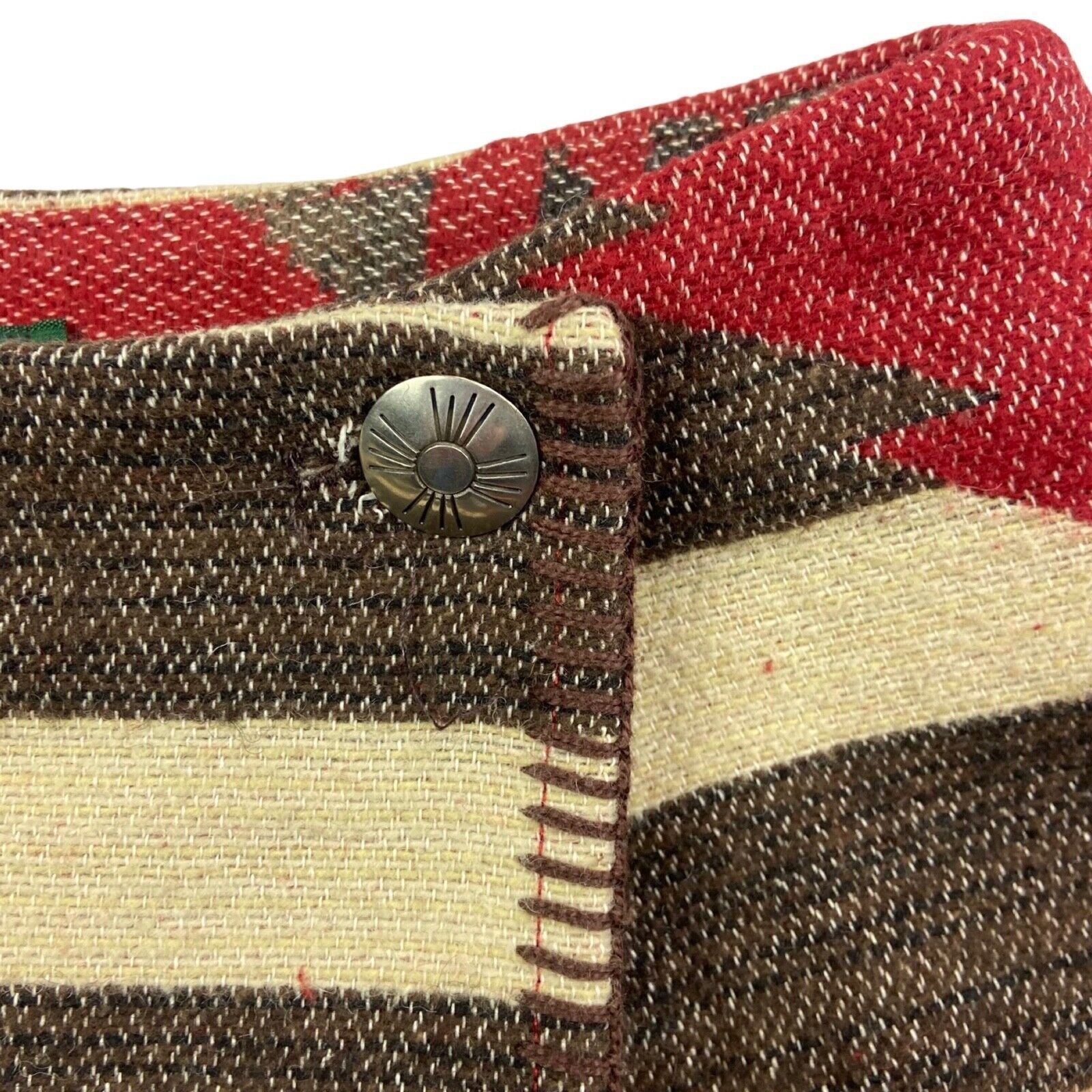 This is a gorgeous Ralph Lauren Denim and Aupply range Native American rockabilly wrap around skirt. Made from a mid-weight cotton blend fabric with no stretch. Features of this skirt include; a chimayo pattern in red, brown and cream, a brown blanket stitch round the hem, a slide hook close in addition to a silver concho button.