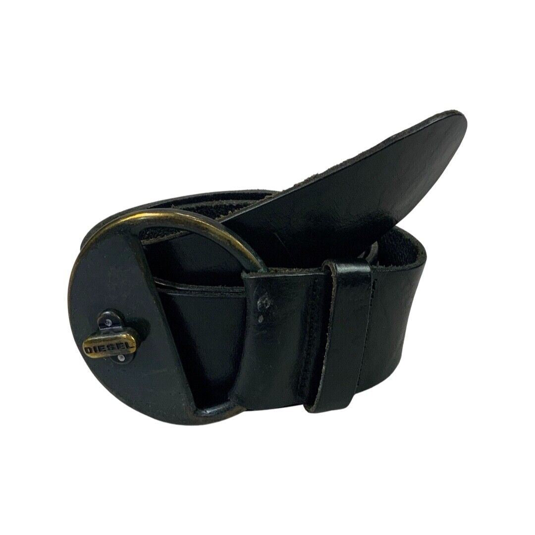This is a funky Y2K black Diesel belt, made from leather. This belt features a large circular buckle with an engraved Diesel detailing, five punched eyelets