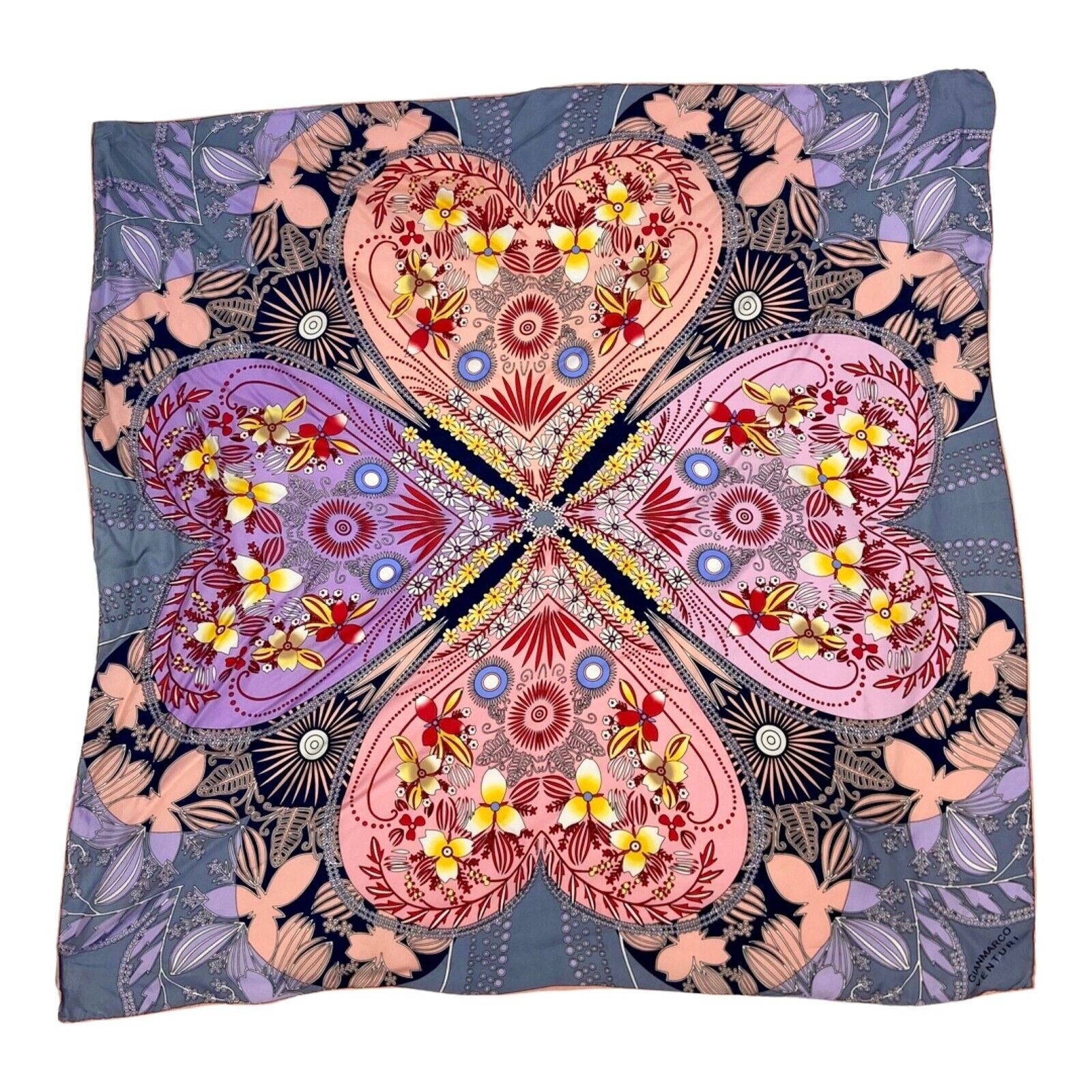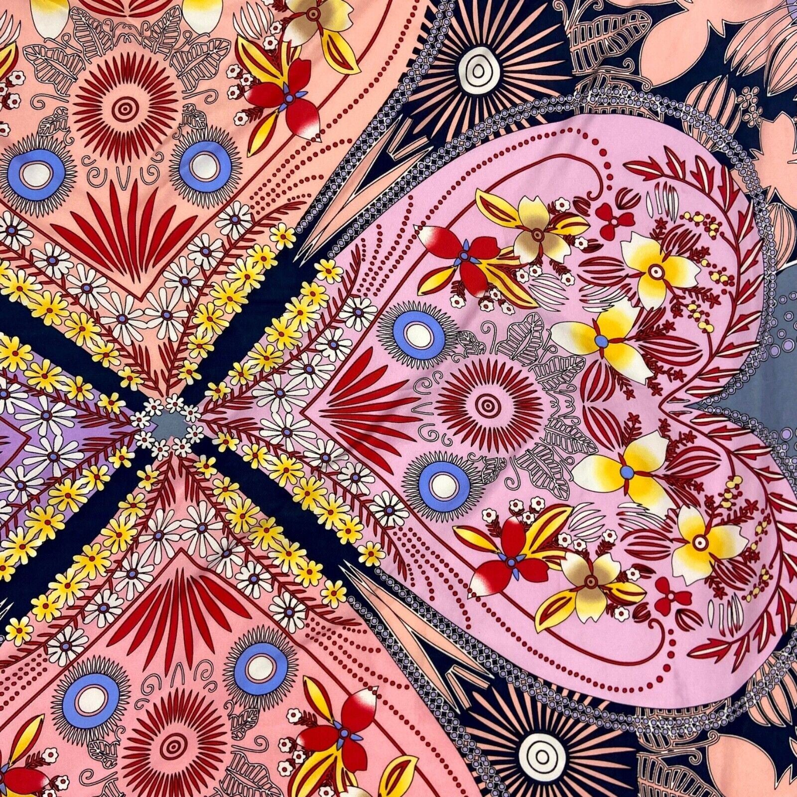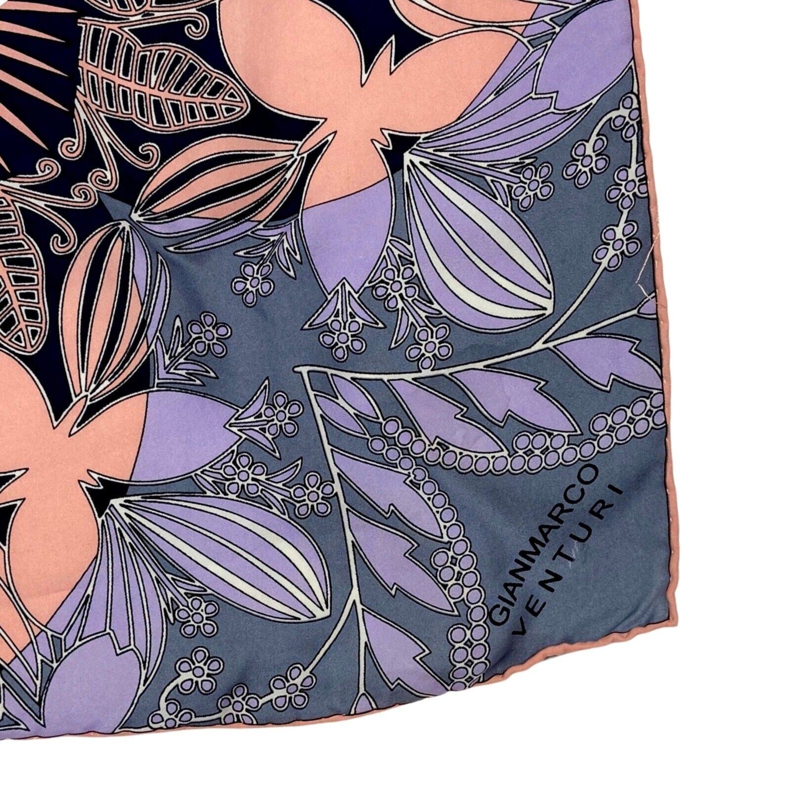 This is a gorgeous Gian Marco Venturi 100% vintage silk scarf. This piece has a gorgeous intricate pattern with a range of beautiful colours such as pinks, reds, purples and blues. The pattern is mostly floral with with some patterned shapes. This scarf has rolled hand stitches edges. The Gian Marco Venturi logo is in the bottom left corner.