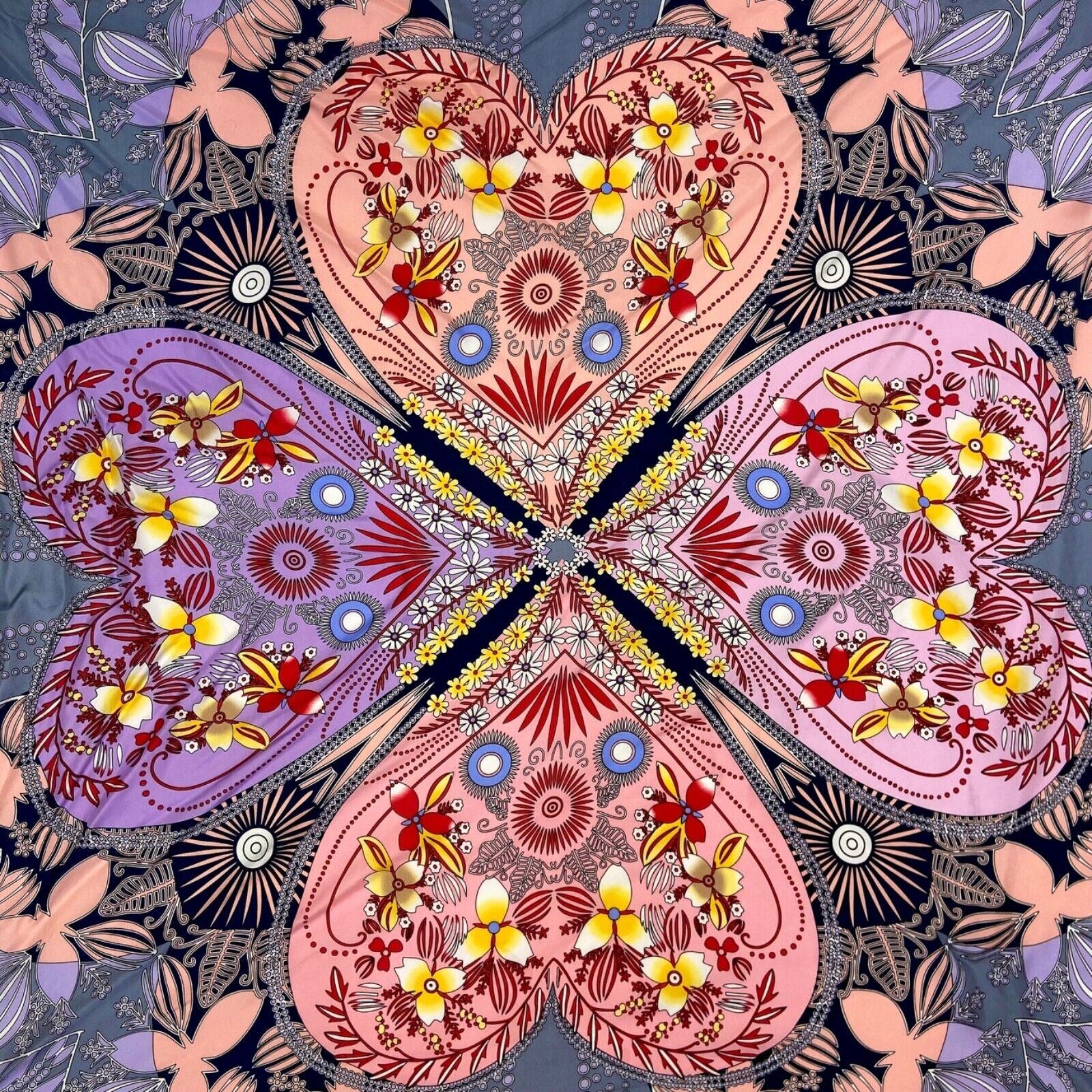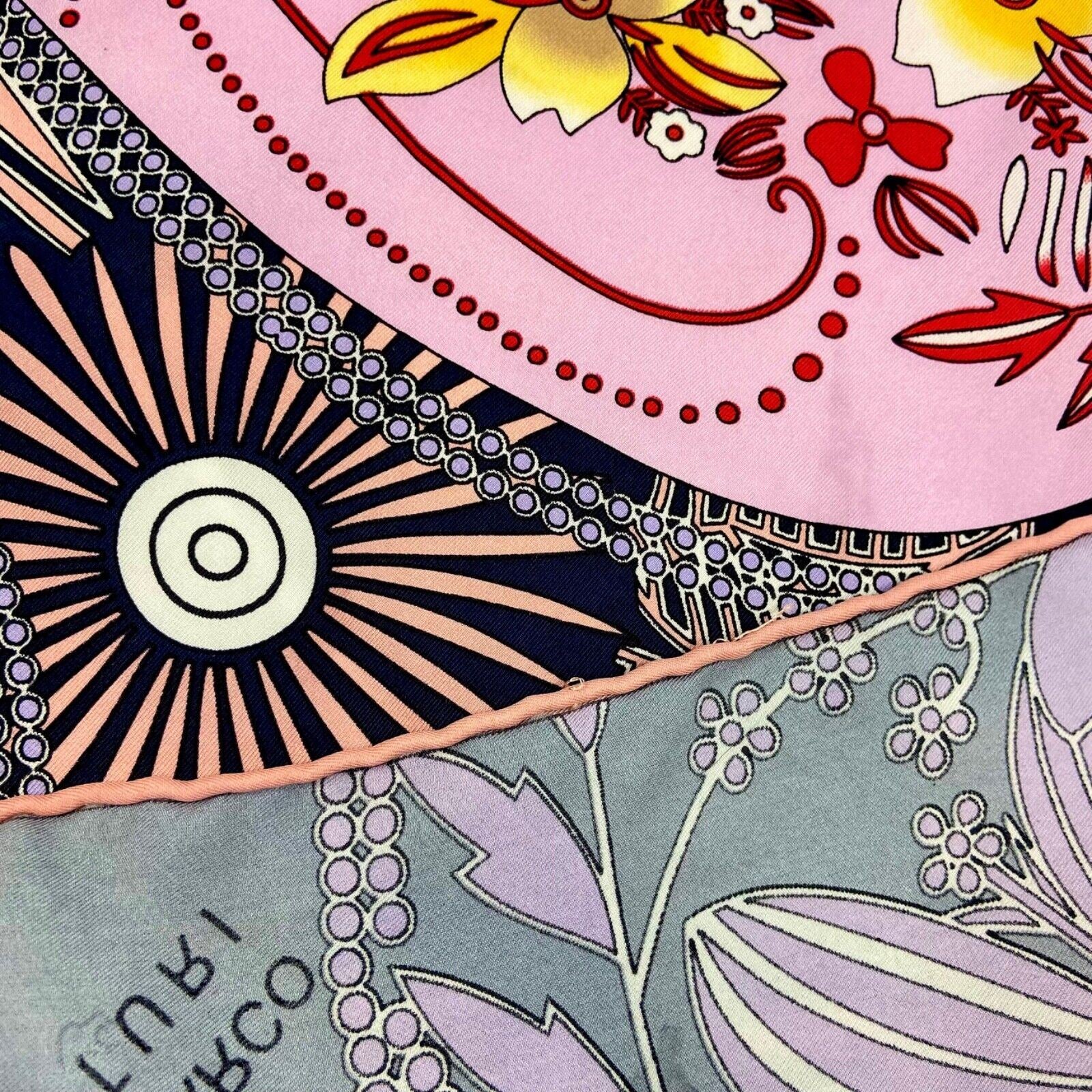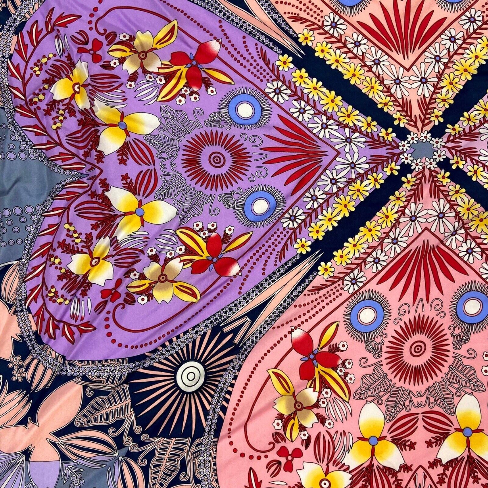 This is a gorgeous Gian Marco Venturi 100% vintage silk scarf. This piece has a gorgeous intricate pattern with a range of beautiful colours such as pinks, reds, purples and blues. The pattern is mostly floral with with some patterned shapes. This scarf has rolled hand stitches edges. The Gian Marco Venturi logo is in the bottom left corner.