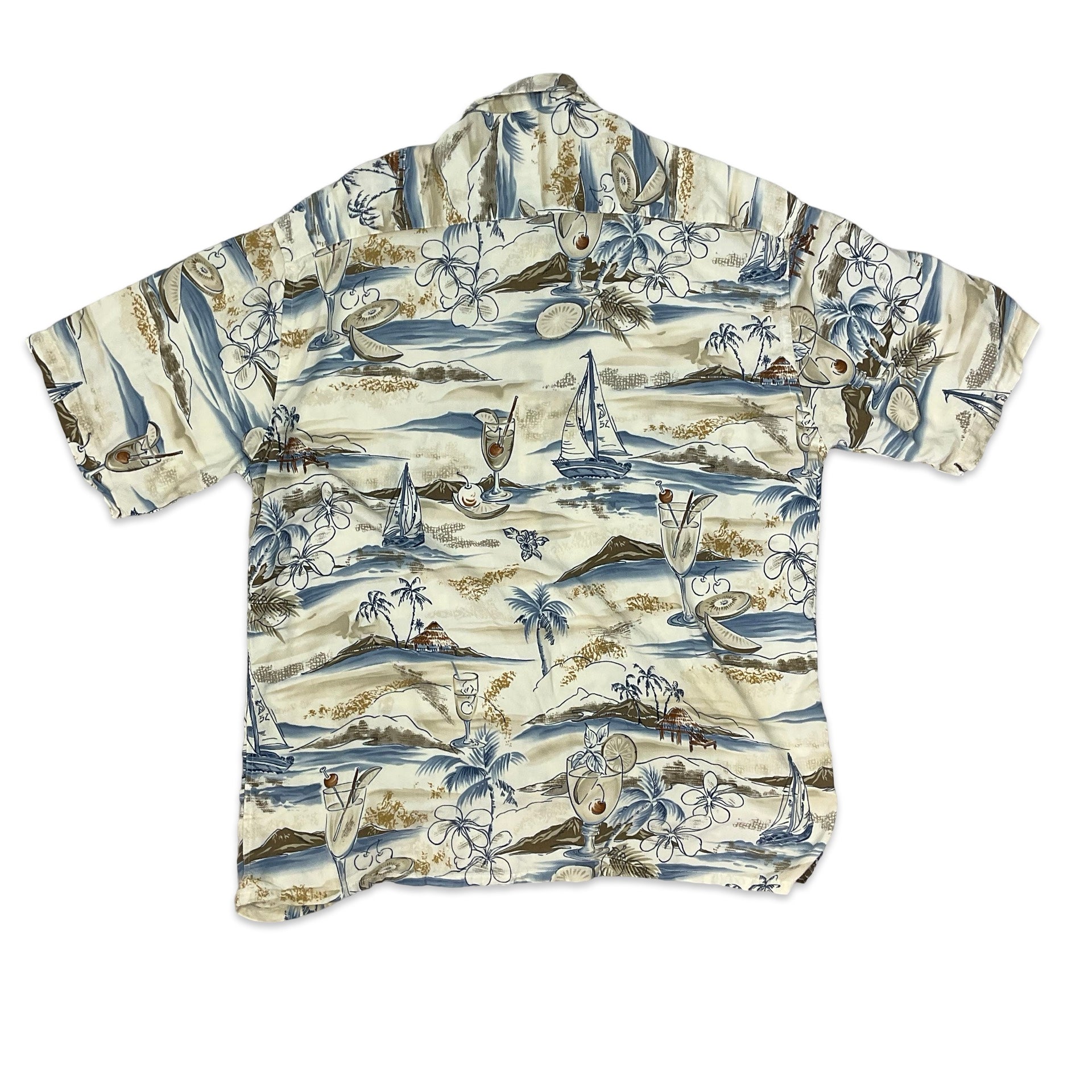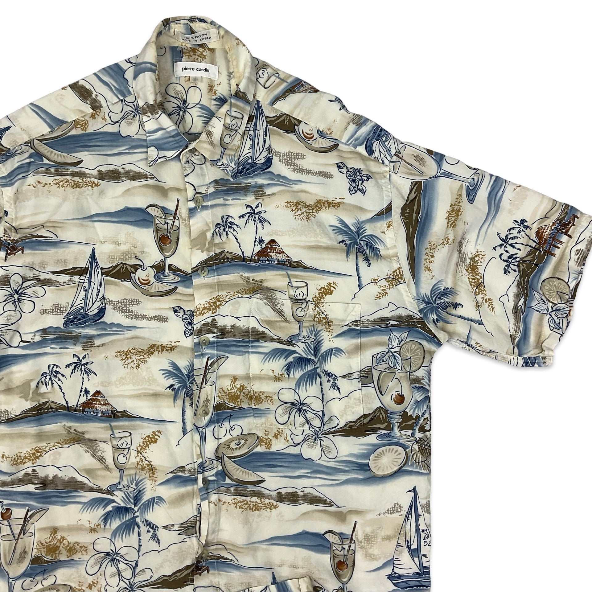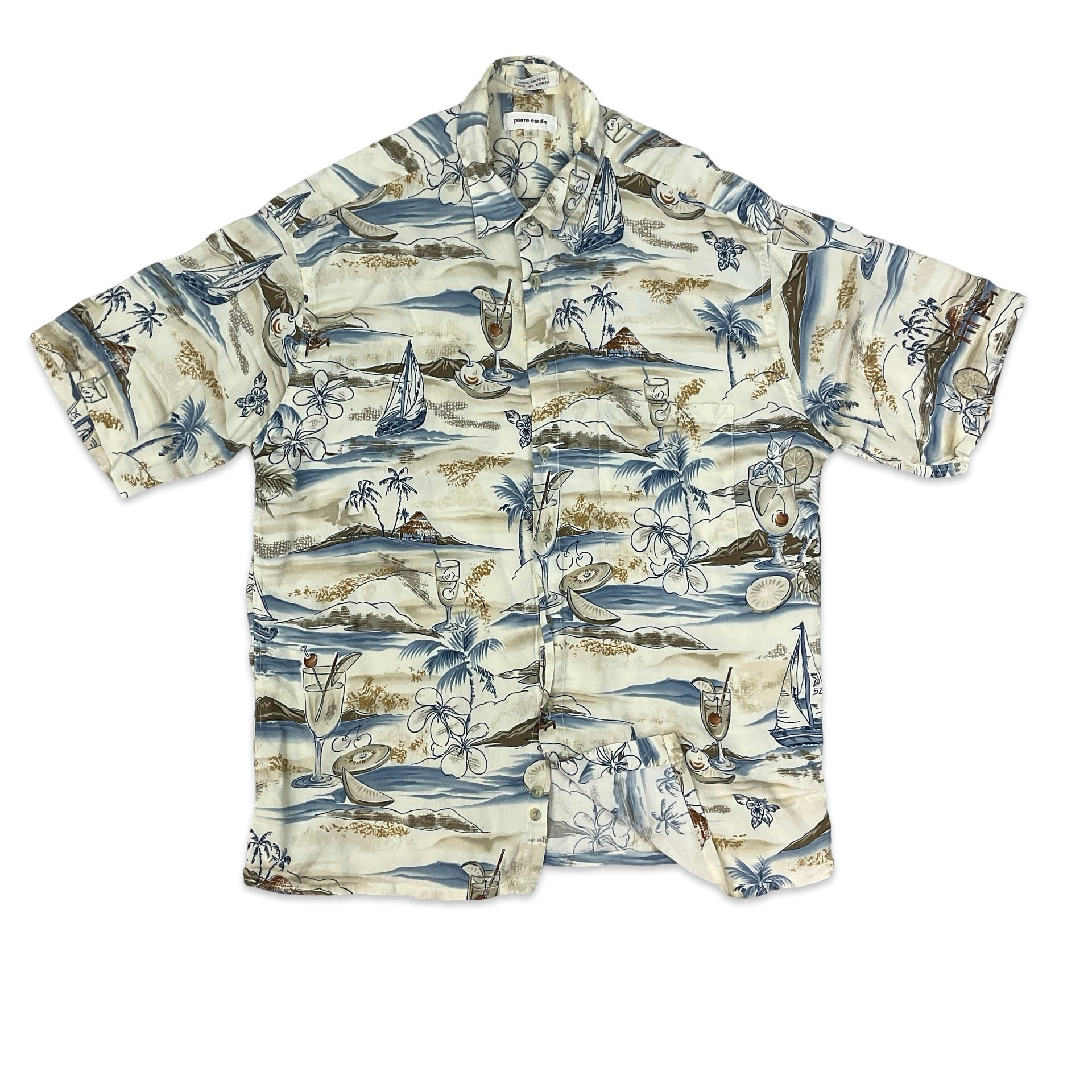 Vintage 1990s - 2000s Pierre Cardin men's short sleeved shirt with all-over beach theme print.