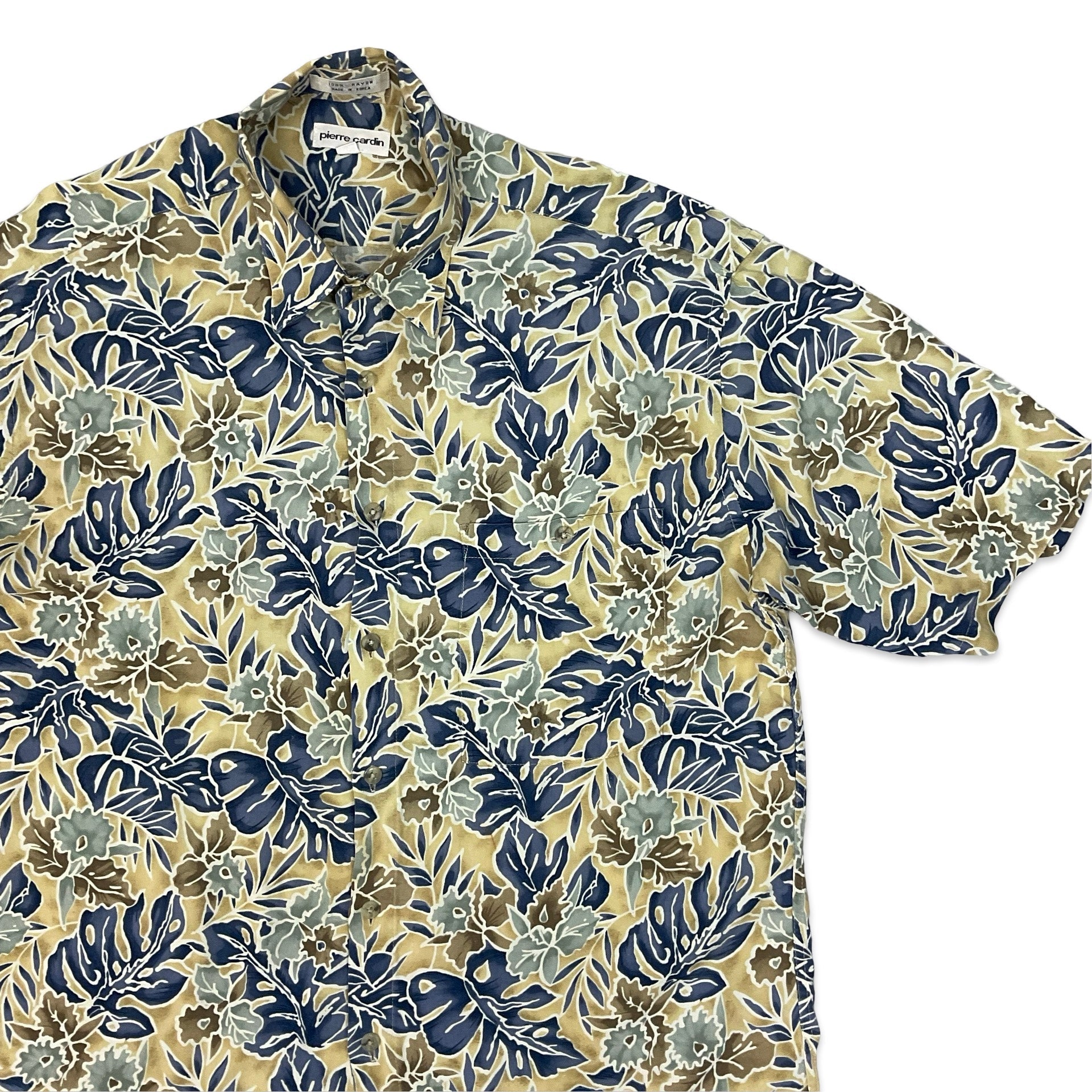 Vintage 1990s-00s Pierre Cardin men's botanical print button-up shirt in yellow and navy.