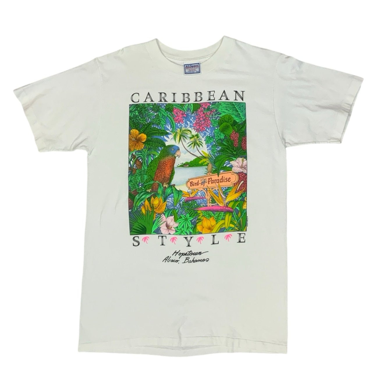 topLovely vintage 1992 Tourist T-shirt, With bright multicoloured tropical print to the front of a beach rainforest scene with a parrot. T-shirt is a "Caribbean Bahamas" tee. In great condition, some slight wear to the print of the tee but this adds to its vintage charm! NO marks stains or damage.