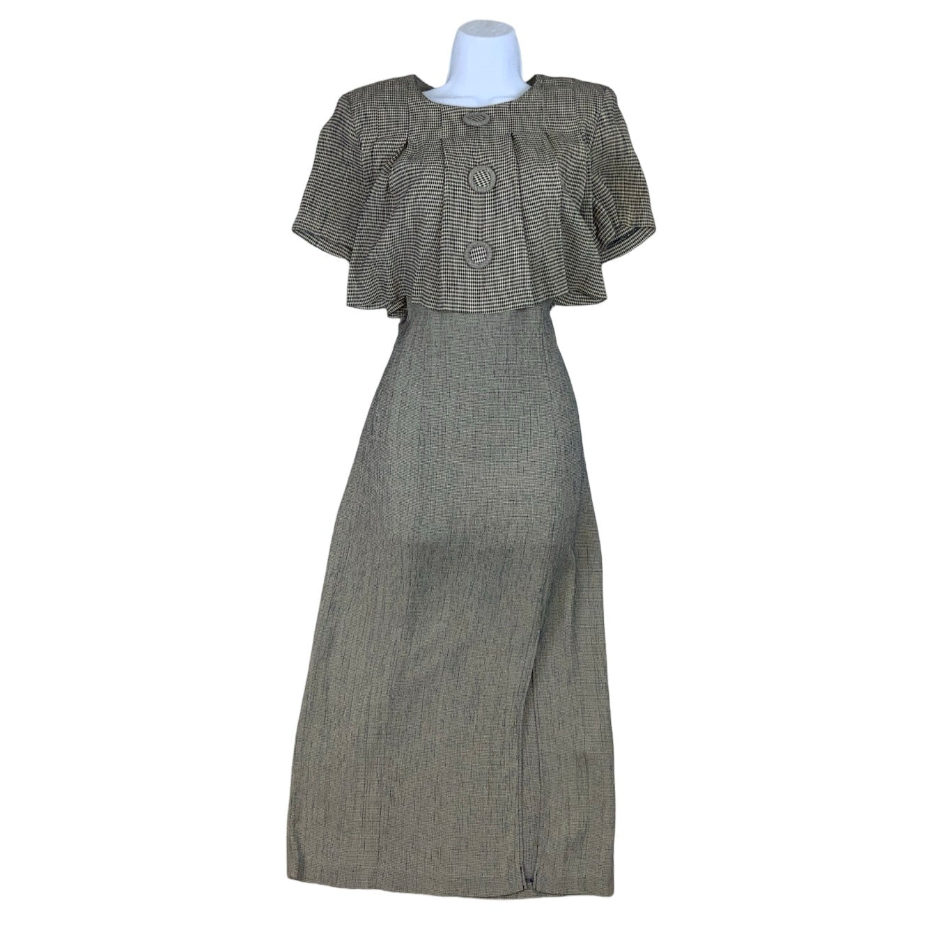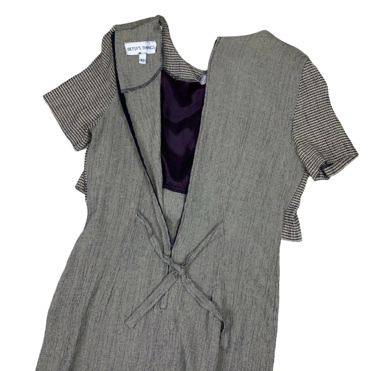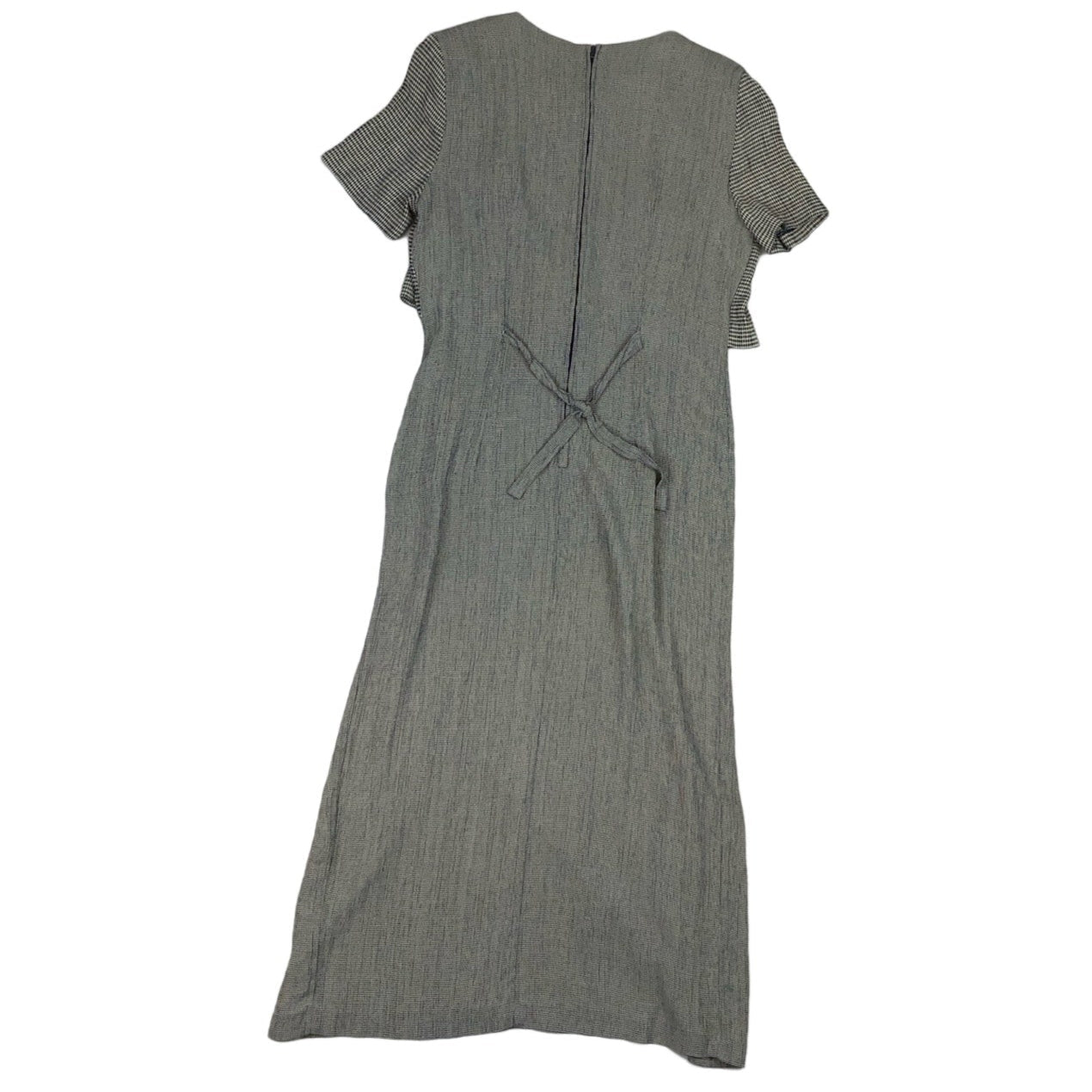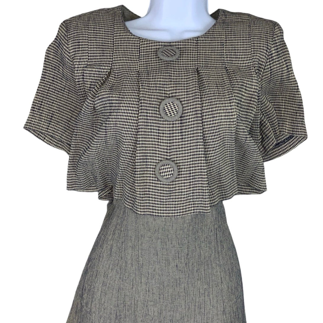 Vintage 1980s/ 90s Betsy's Things midi dress in grey and blue checks at the front and houndstooth at the back. This dress gives the illusion of a blouse and a skirt with faux button detail. Back zip fastening and tie belt detail.