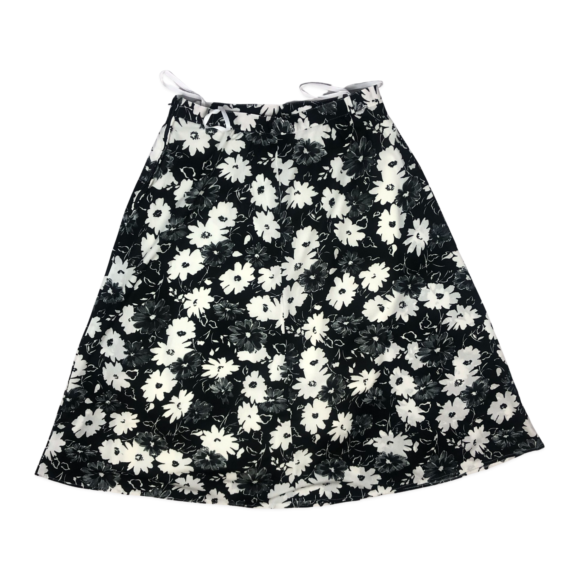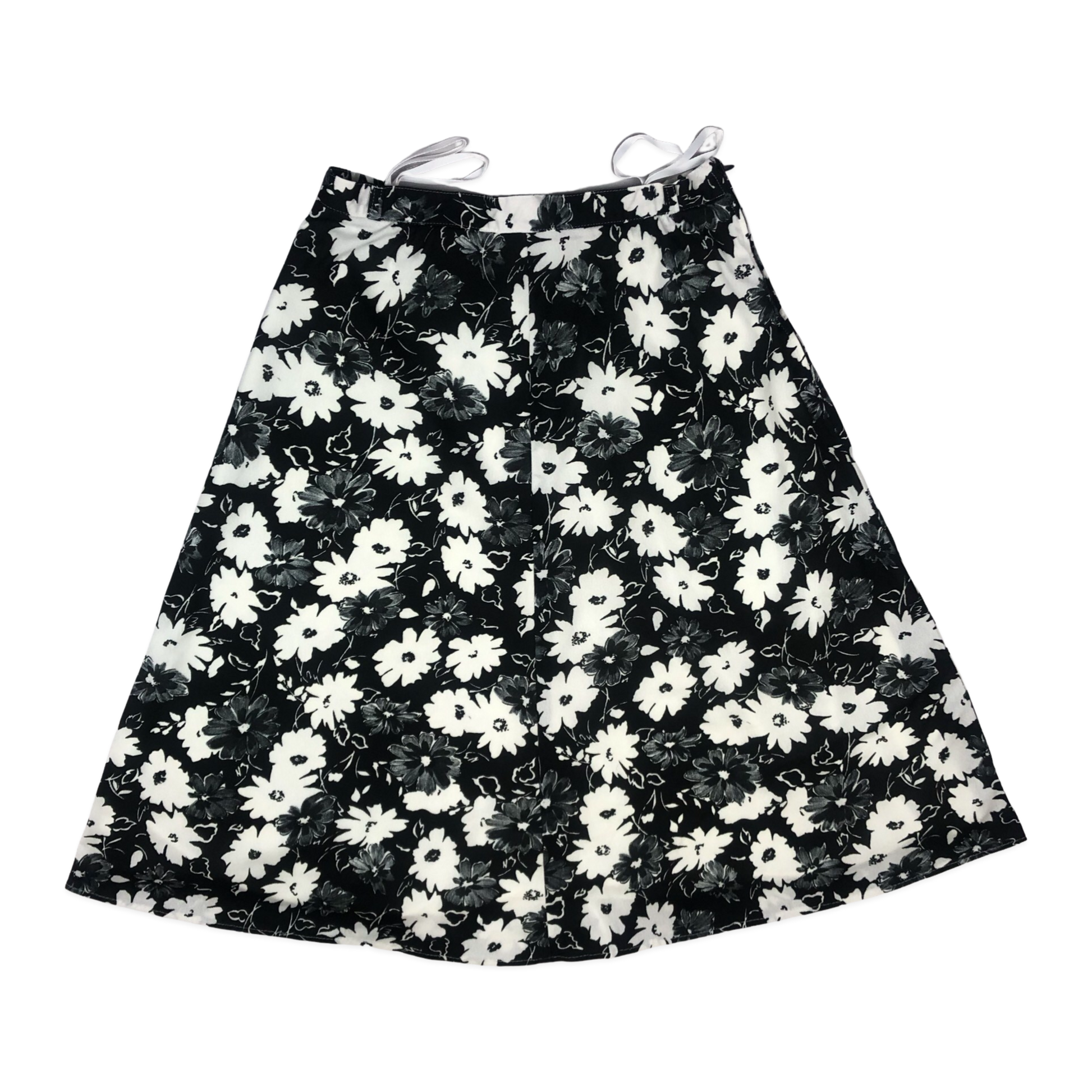 Vintage 60s 70s A-line skirt with grayscale floral print and zip fastening.