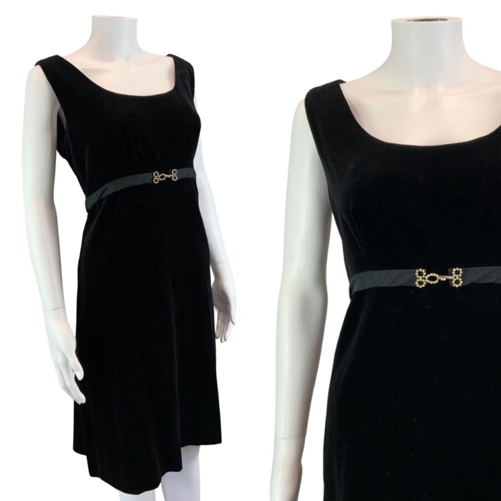 Vintage 60s 70s Black Velvet Belted Sleeveless Mid Length Mod Dress S 8/10