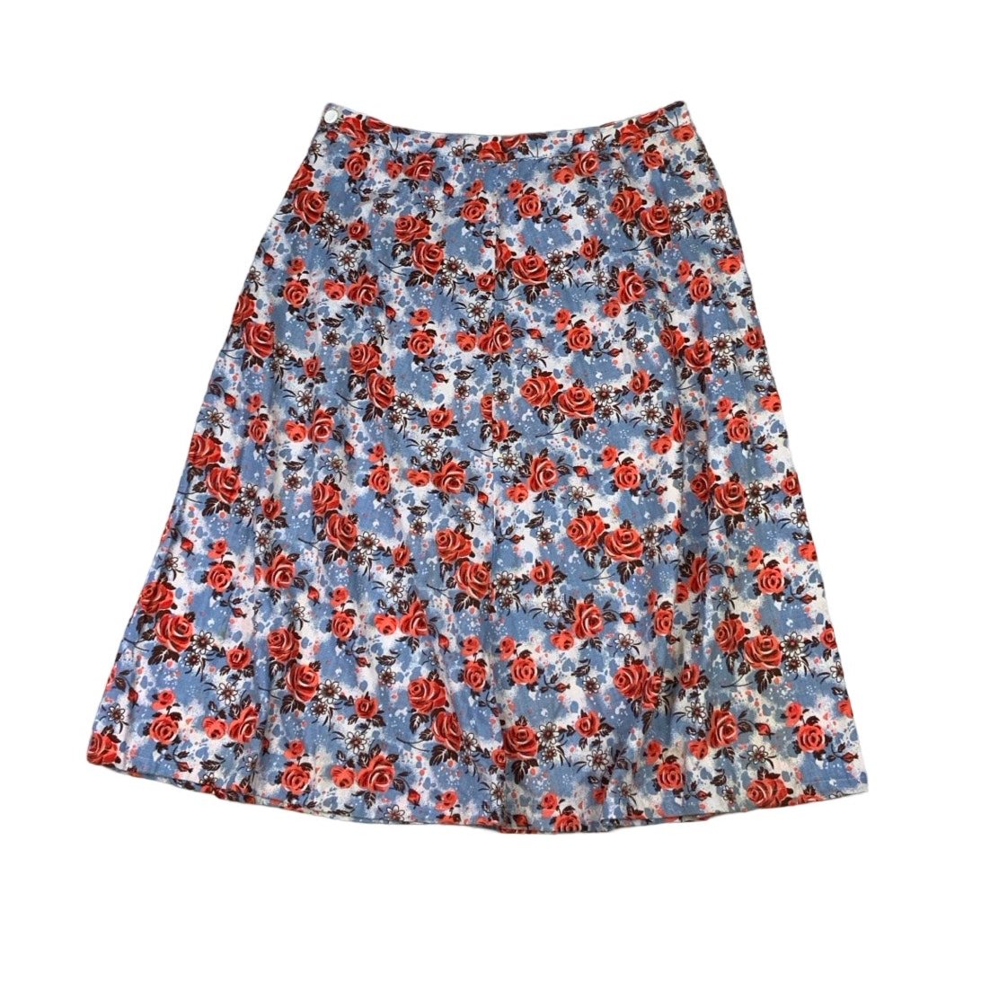 Vintage 60s 70s Floral Blue Red White Midi Skirt S 6 8