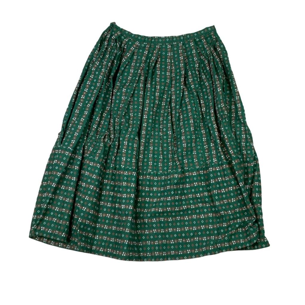 1960s/70s pleated midi skirt in green with red and white floral pattern in vertical lines throughout. Side zip and button fastening. No mention of materials, feel cotton.