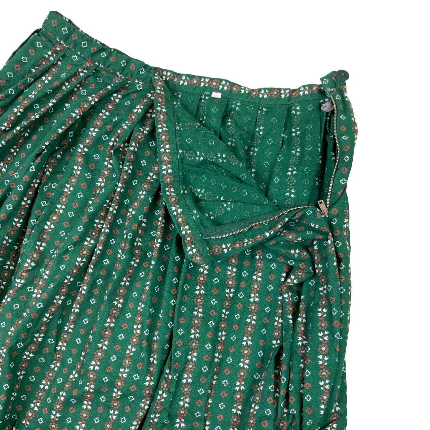Vintage 60s 70s Green Red Floral Pleated Midi Skirt XS 4 6