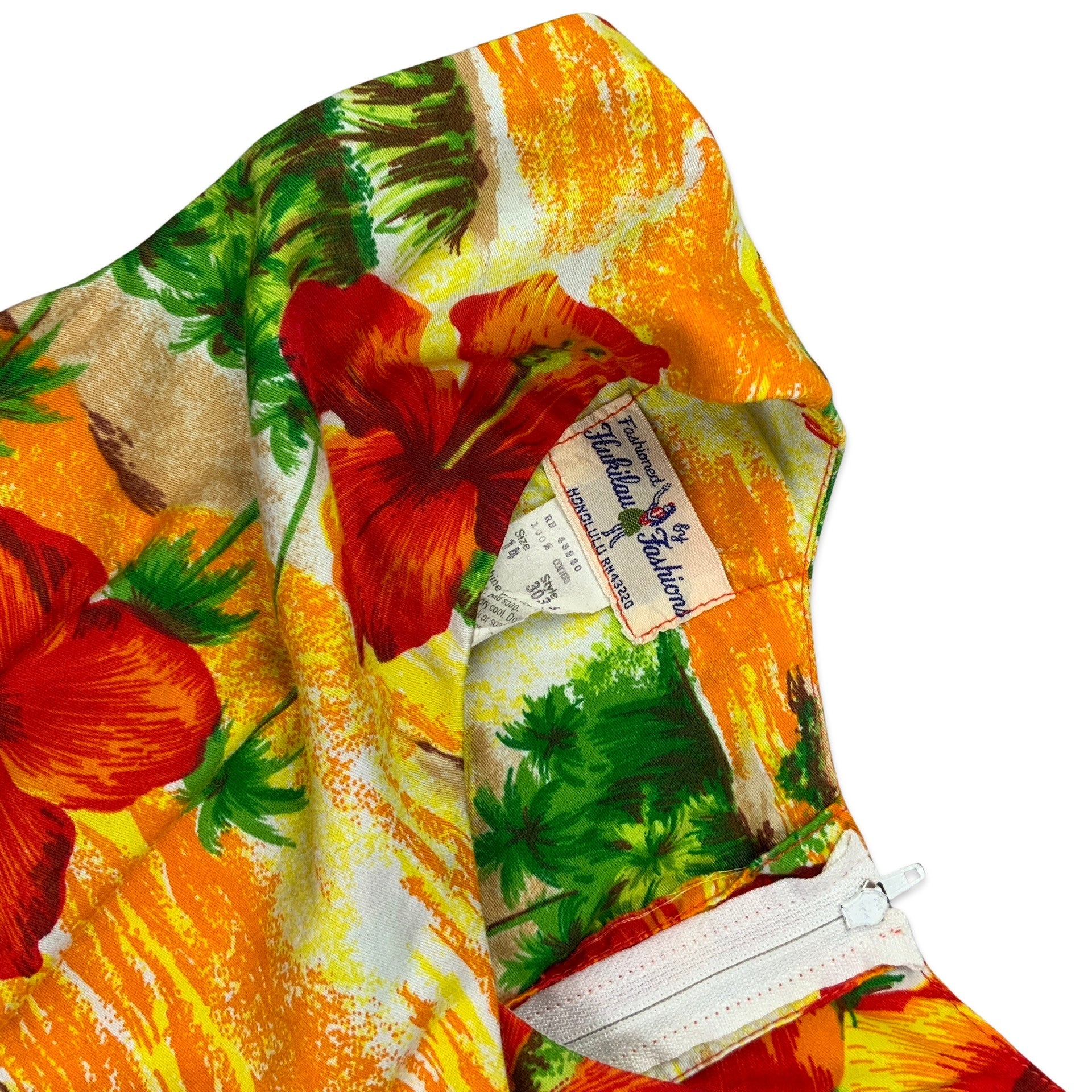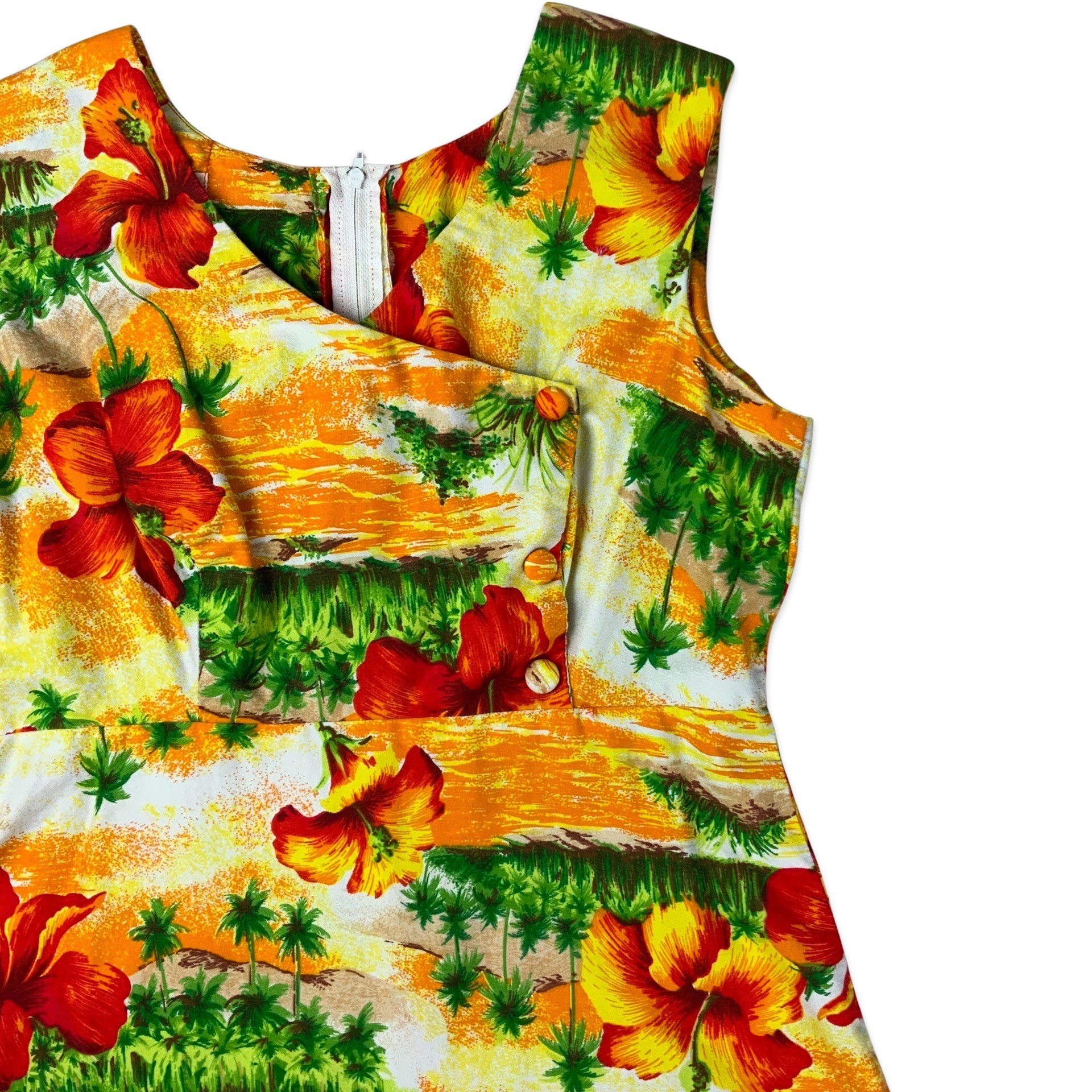 Vintage 1960s-1970s Hukilau Fashions Hawaiian dress with faux button-up bodice and back zip fastening. 100% cotton sleeveless dress with tropical orange and green print.