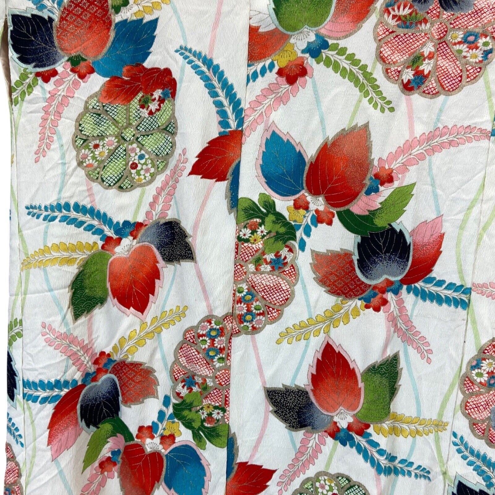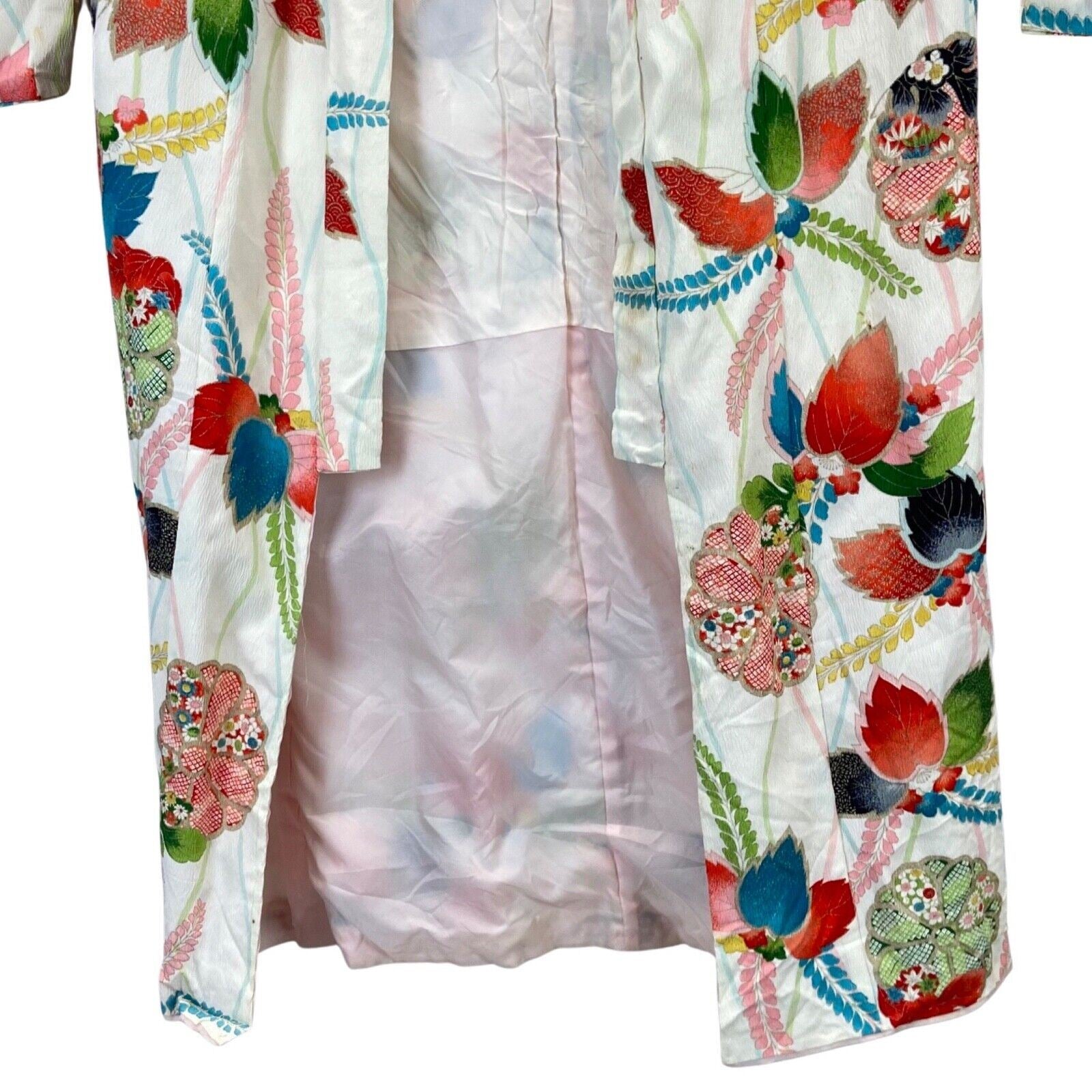 Vintage 60s 70s White Green Pink Silk Floral Komon Showa Kimono 8 10 S