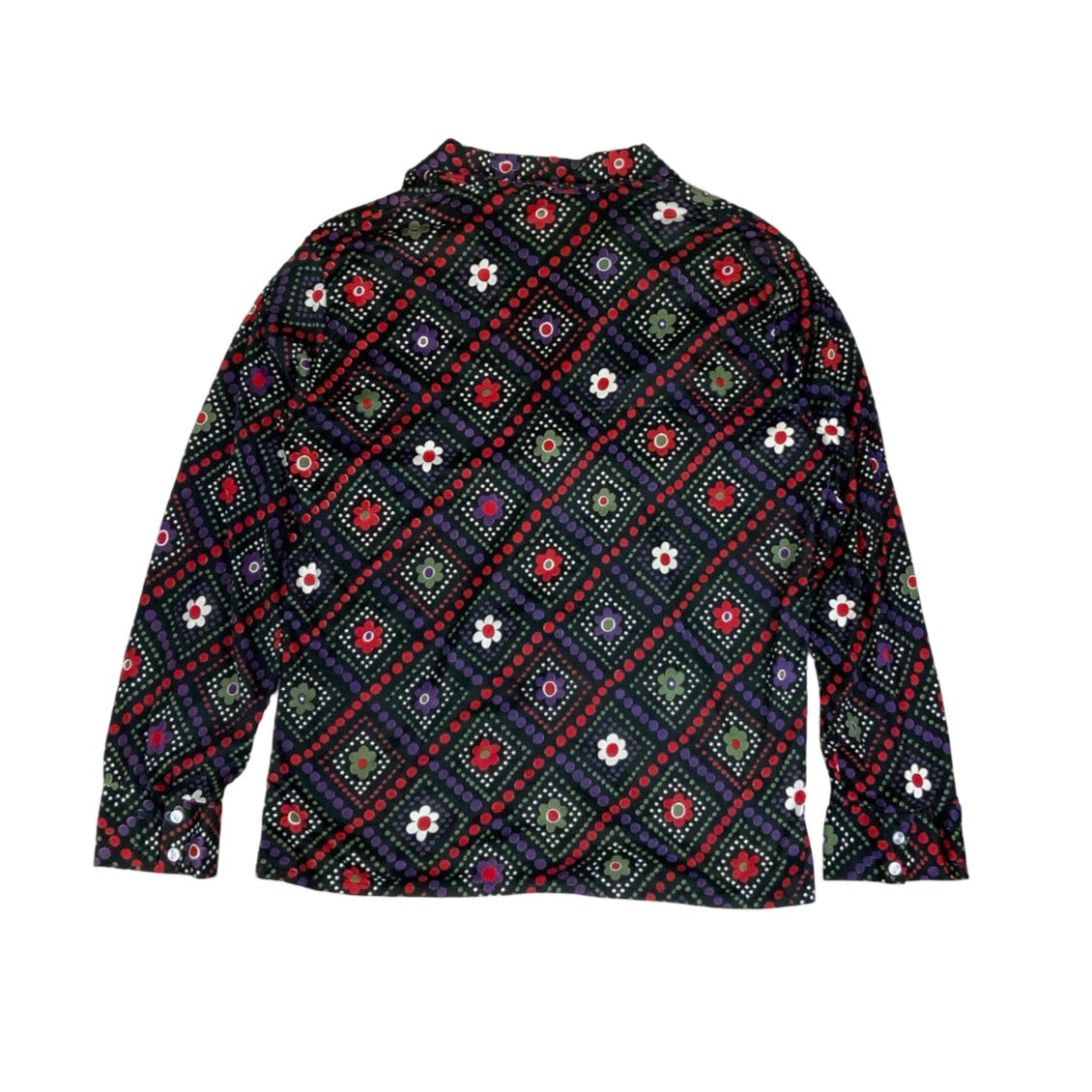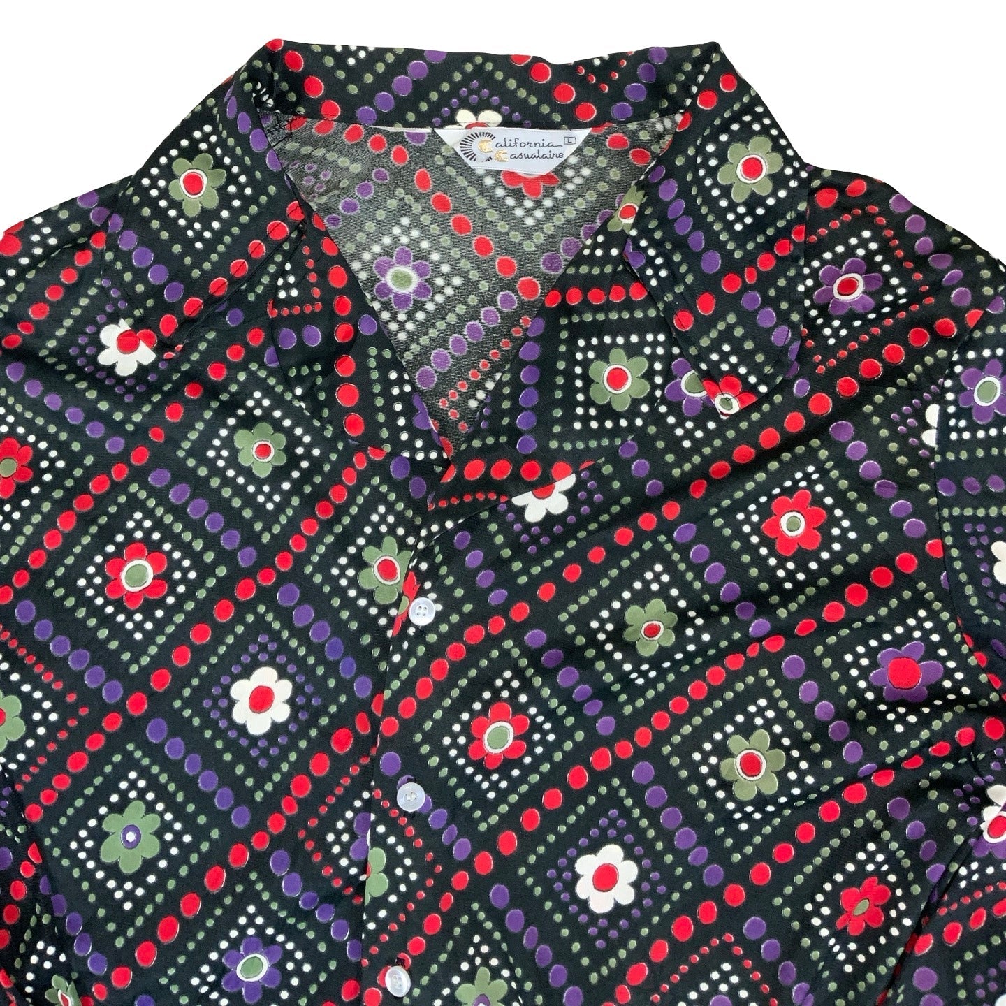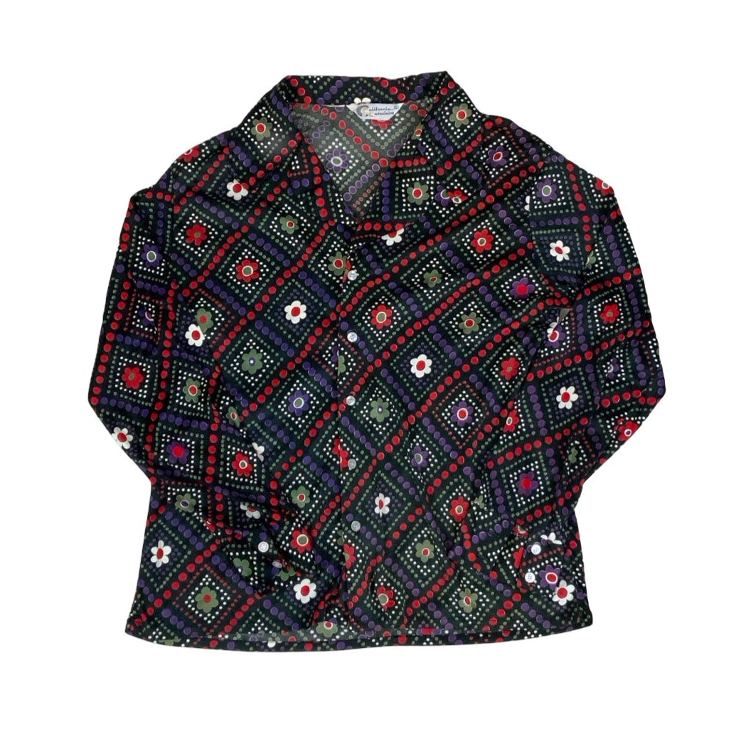 Vintage 1970s/80s California Casualaire branded wind collared button down shirt with long sleeves and a geometric pattern in black, red, purple and white with a floral deign.