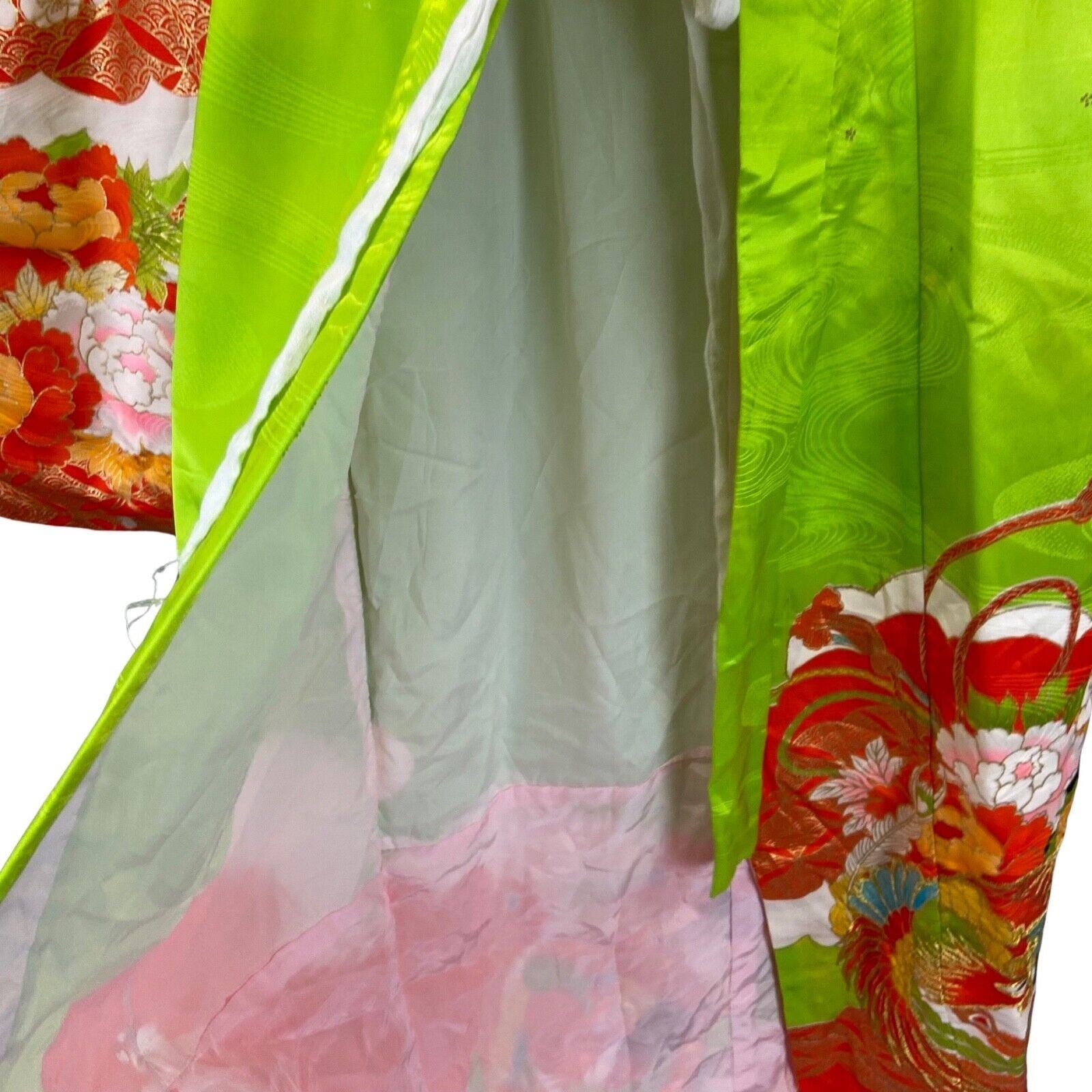 Vintage 70s 80s Green Red Orange Silk Embroiderd Floral Komon Showa Kimono 8 S