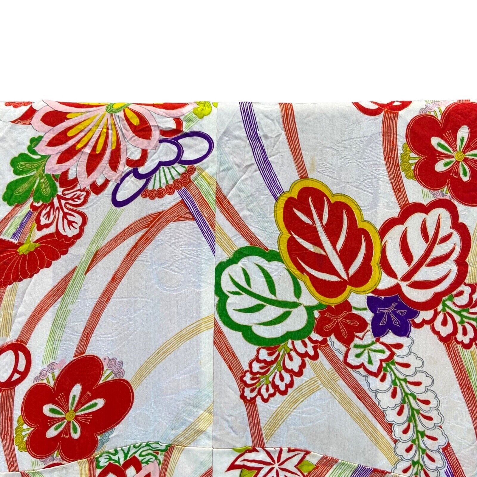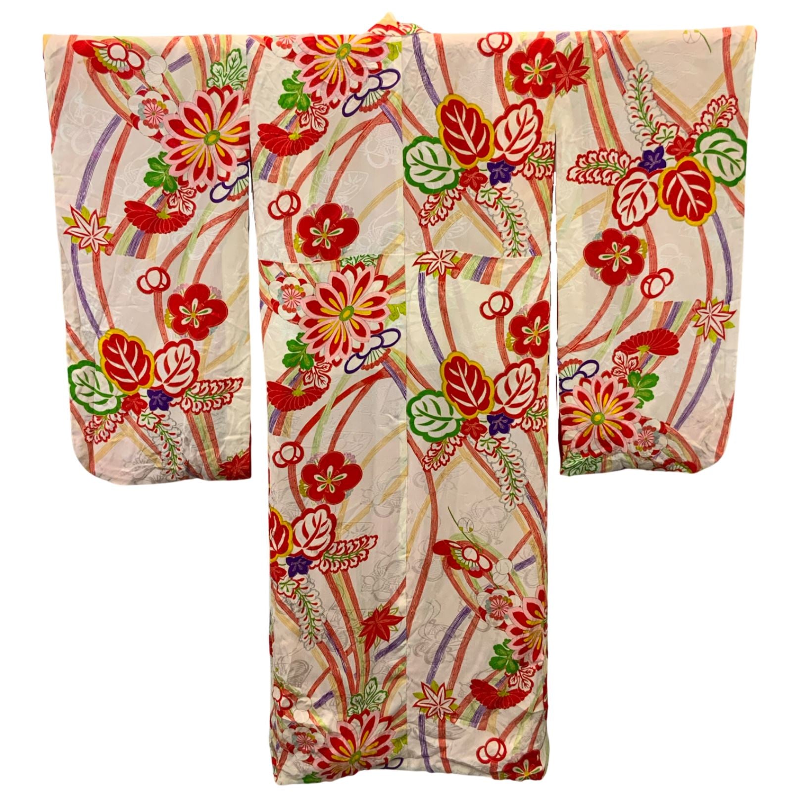 This is a gorgeous Showa Komon Kimono made from pink patterned silk with a soft red lining and beautiful red tie in the centre. Features include; an all over floral and geometric patterns in bright colours (greens, yellows and reds) and shining accents overlaying the patterns. This item has some light markings.