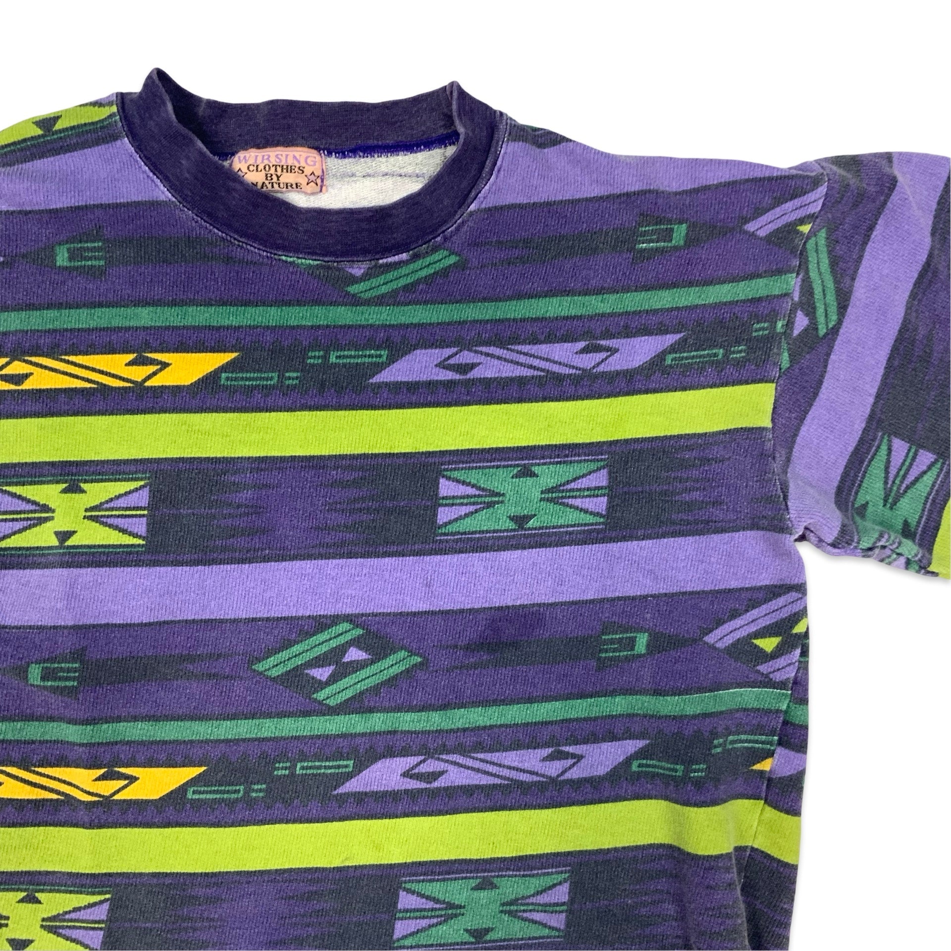 Vintage 1970s-80s crew neck sweatshirt in purple and green with abstract Aztec print.