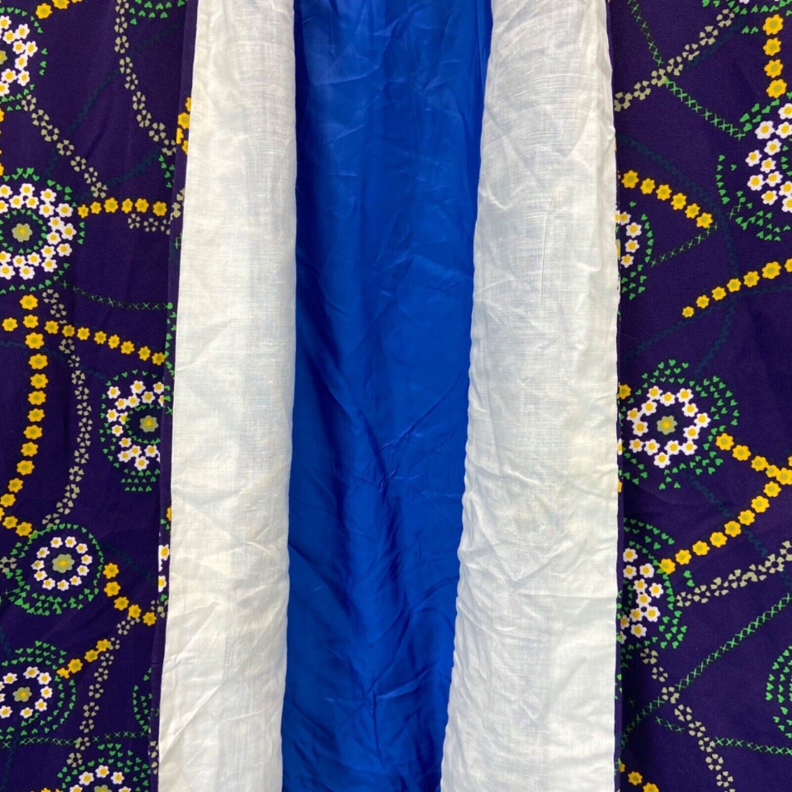 This is an awesome Komon Haori Kimono made from a dark purple patterned Polyester material with minimal stretch and a soft lining. Features include; an all over purple with white and yellow geometric prints and a blue lining.