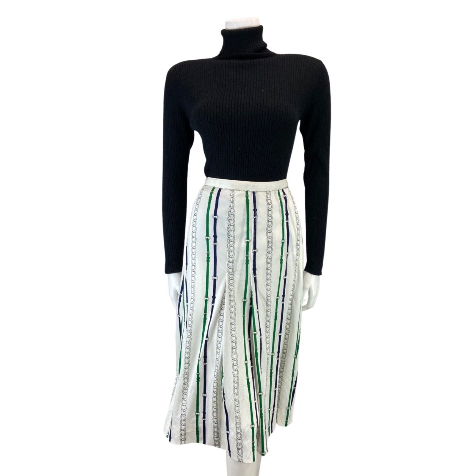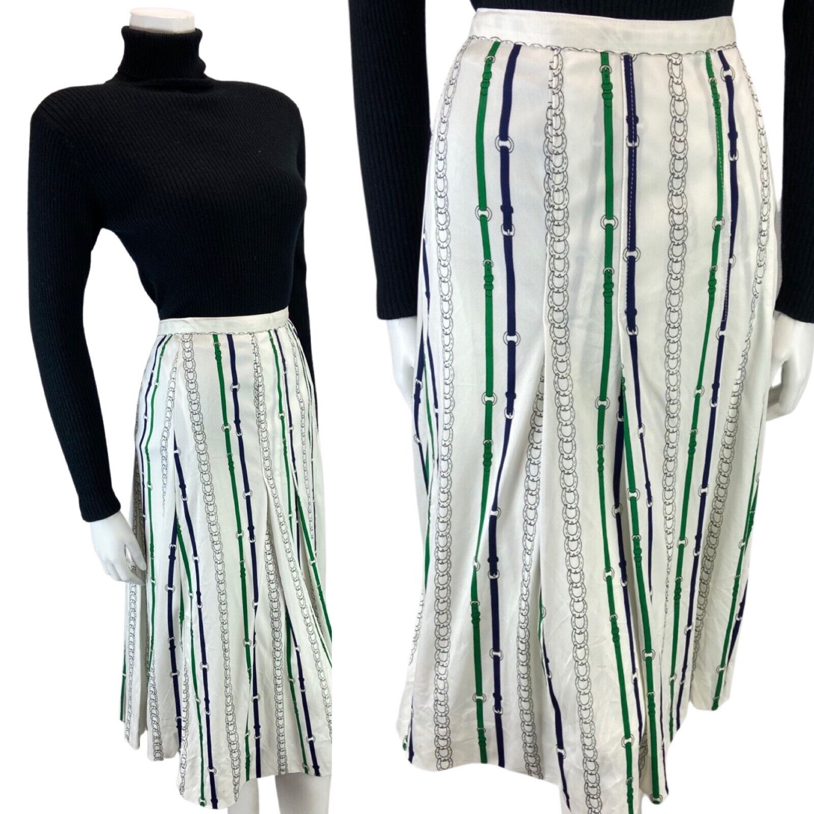 VINTAGE 70s 80S WHITE GREEN STRIPE HORSE SHOE CHAIN MIDI SWING SKIRT S 8 10 S