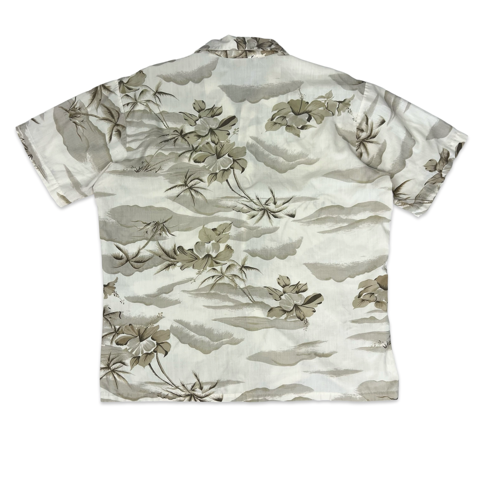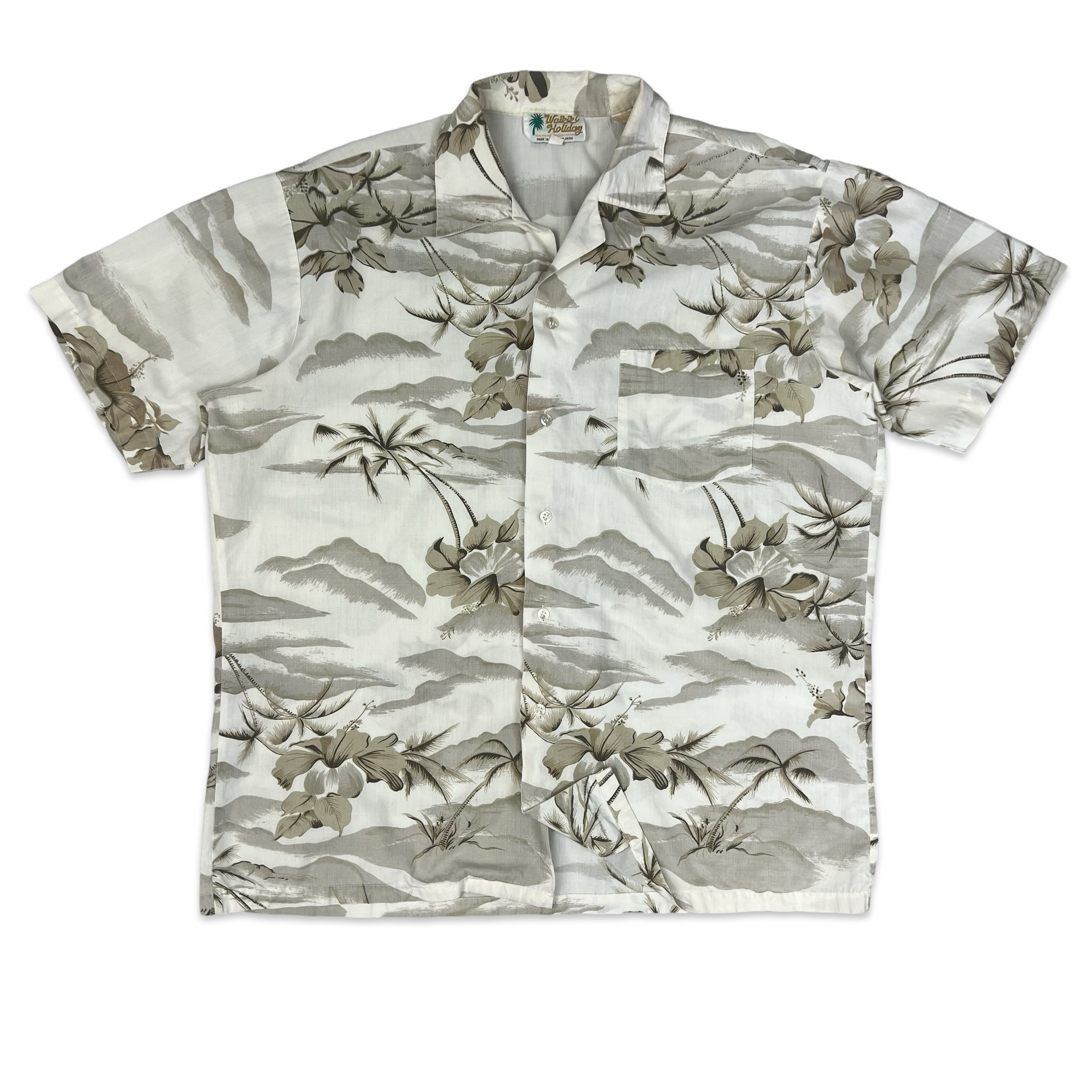 Vintage 70s Beige Botanical Print Aloha Shirt L