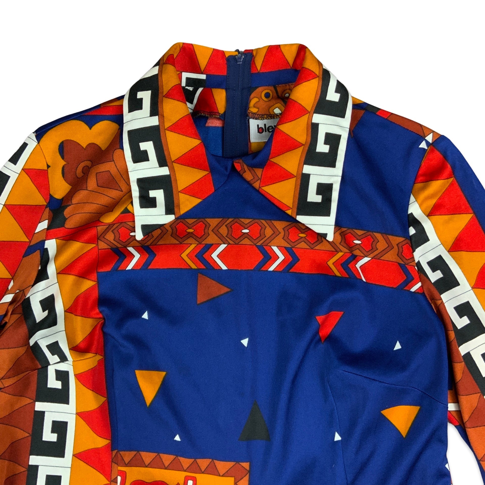 Vintage 70s Blue Orange White Geometric Pattern Tunic Top 8 10