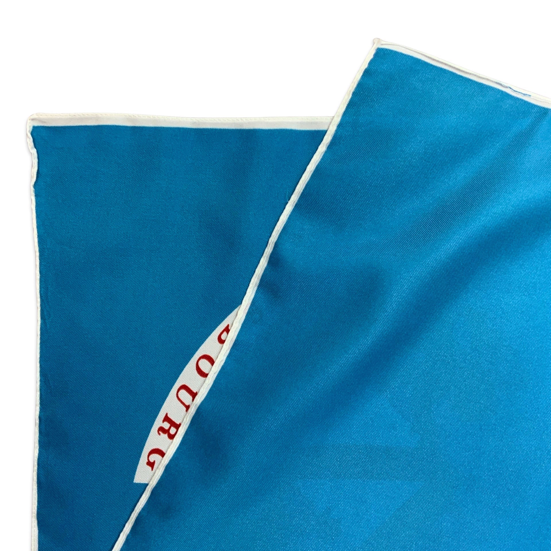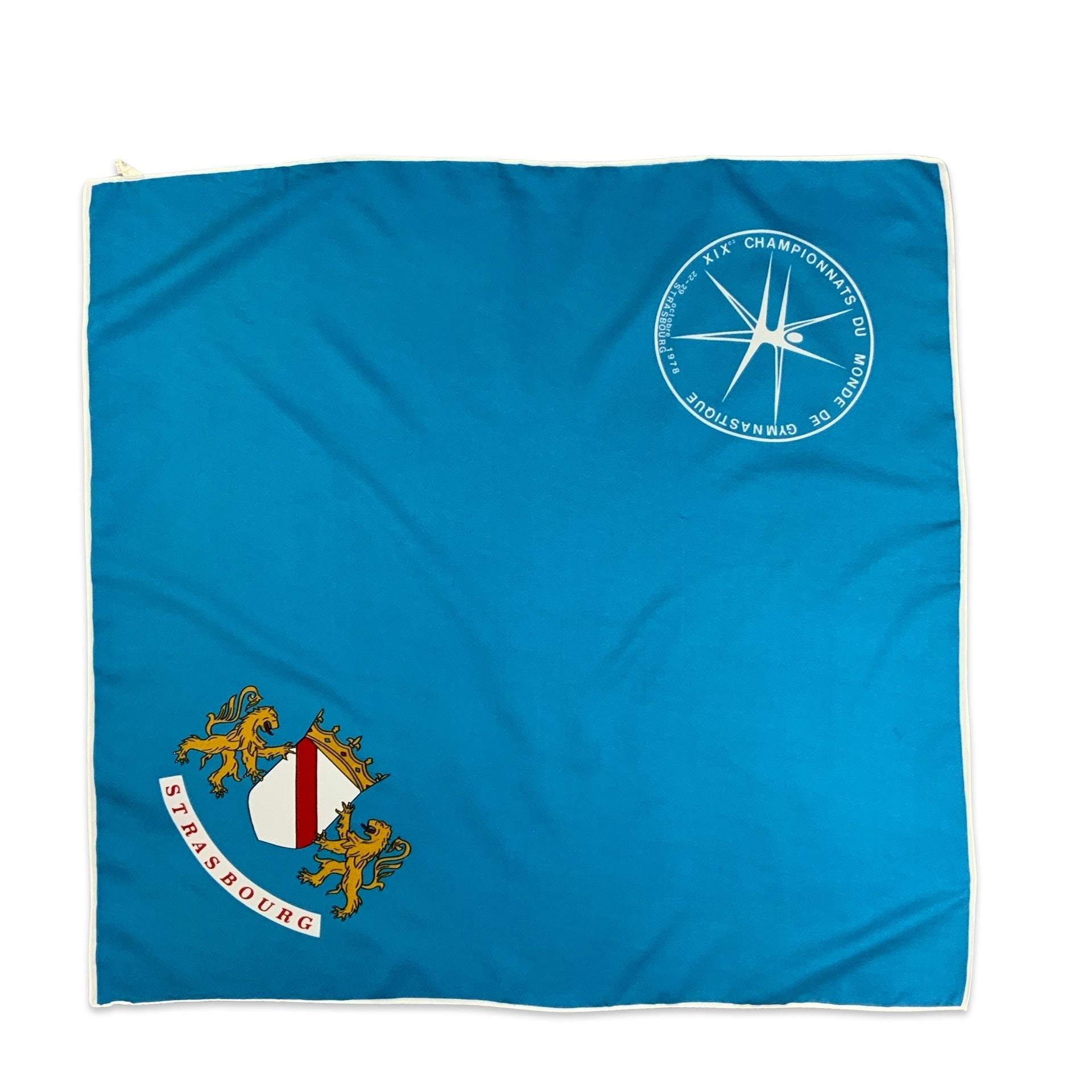 Vintage merchandise scarf from the 1978 World Artistic Gymnastics Championships, held in Strasbourg. Court of arms detail and sports logo. Aqua blue, white detailing, gold and red heraldry. Lightweight polyester.