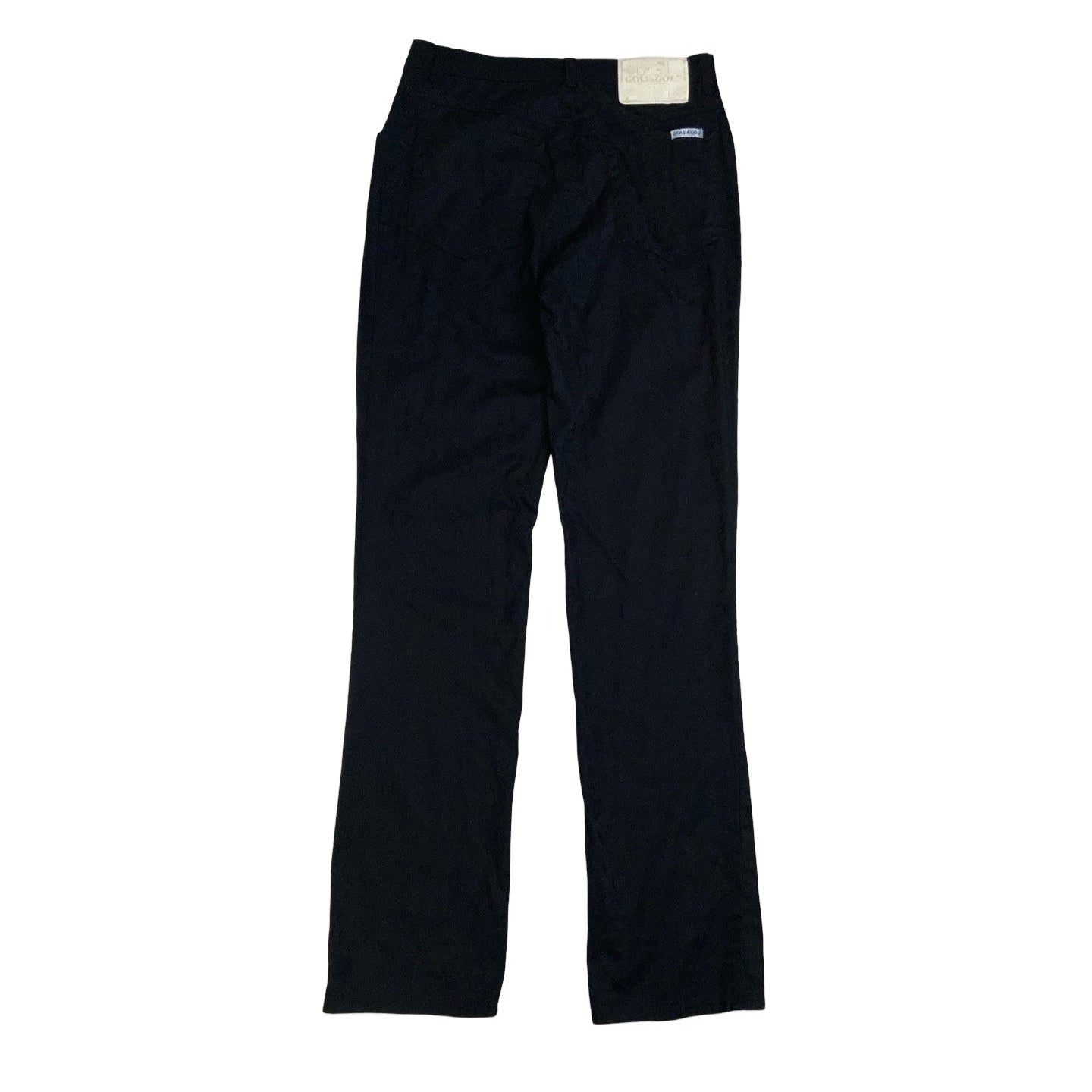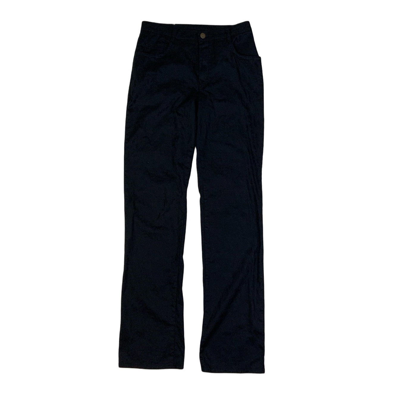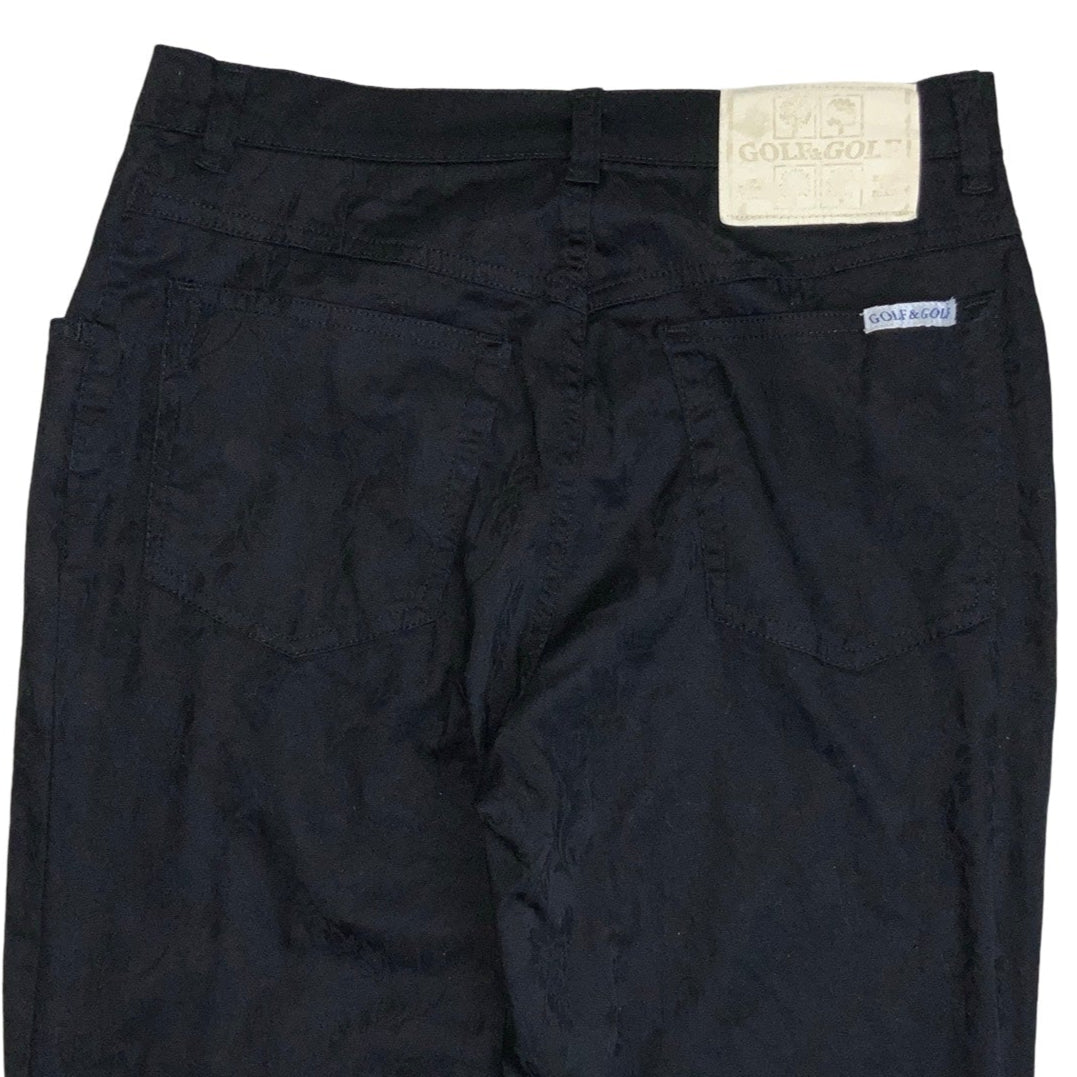 Vintage 1970s Golf&Golf high waisted black gothic flared trousers with subtle botanical patterns. Front zip fly, side pockets and bum pockets.