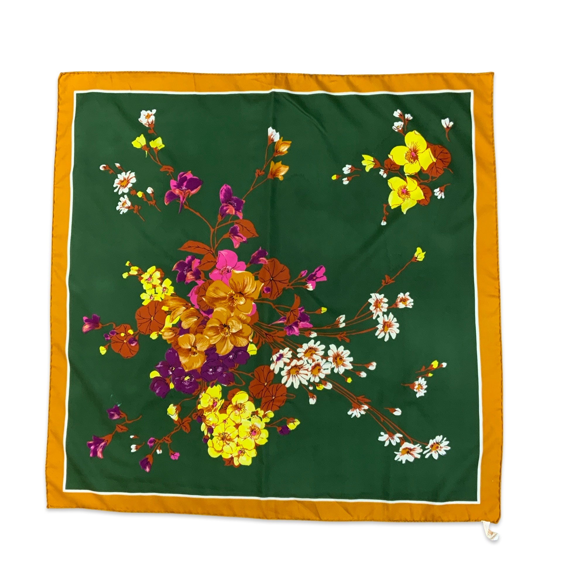 Vintage bold, large floral print scarf. Bottle green, pink, purple, mustard and brown. Made from polyester.