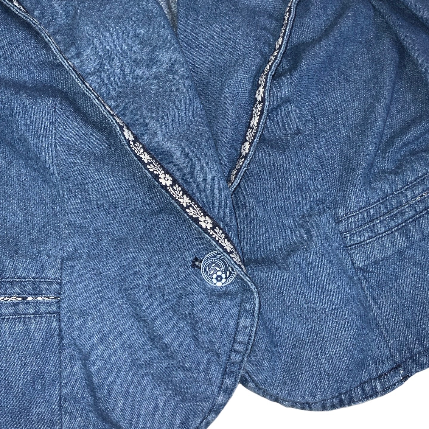 Vintage 1970s/80s Heller-Sport light blue cropped denim jacket with floral embroidered detail around the hemming and blue and white floral button fastening.