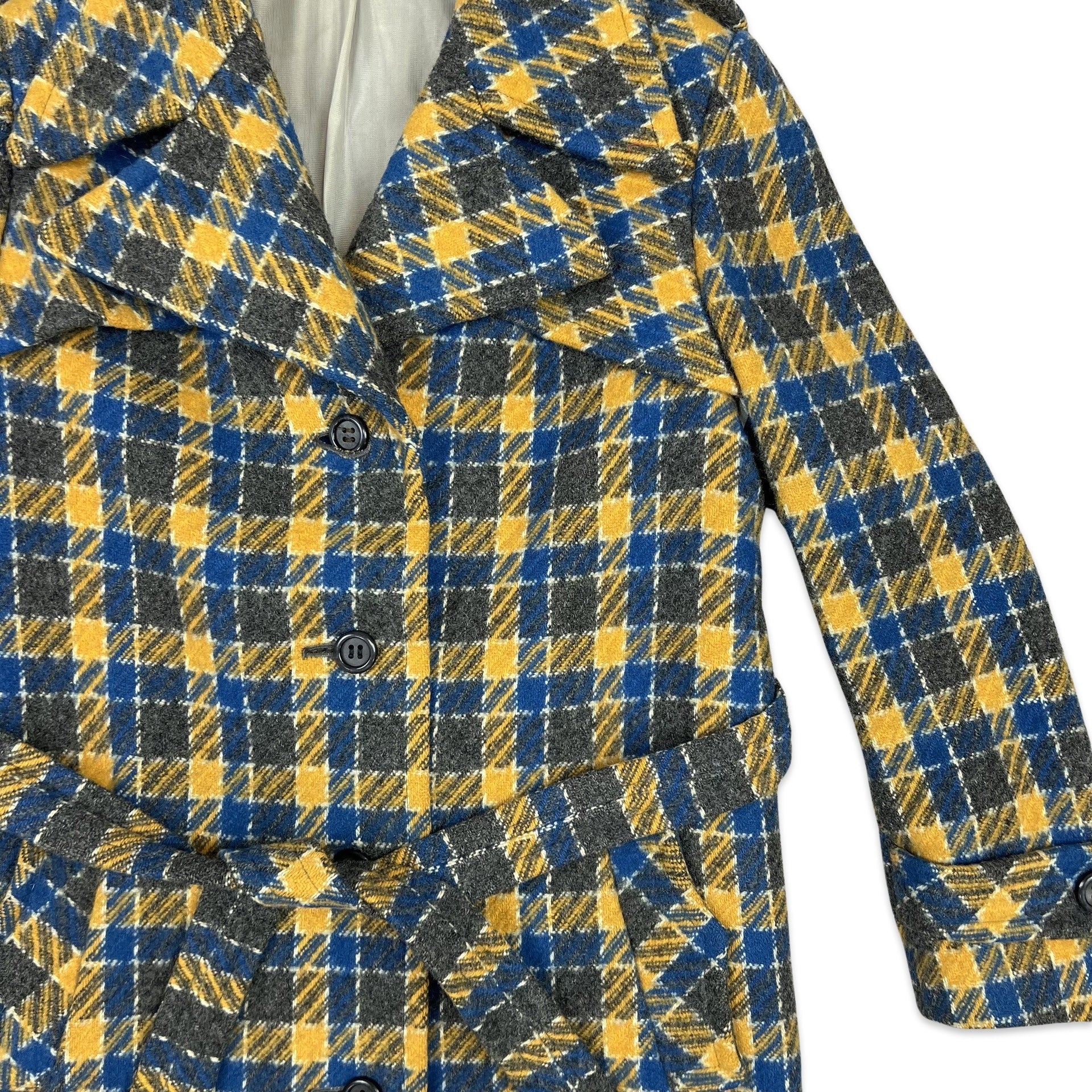 Vintage 70s Wool Midi Coat Blue Yellow Charcoal Tartan Check 6 8