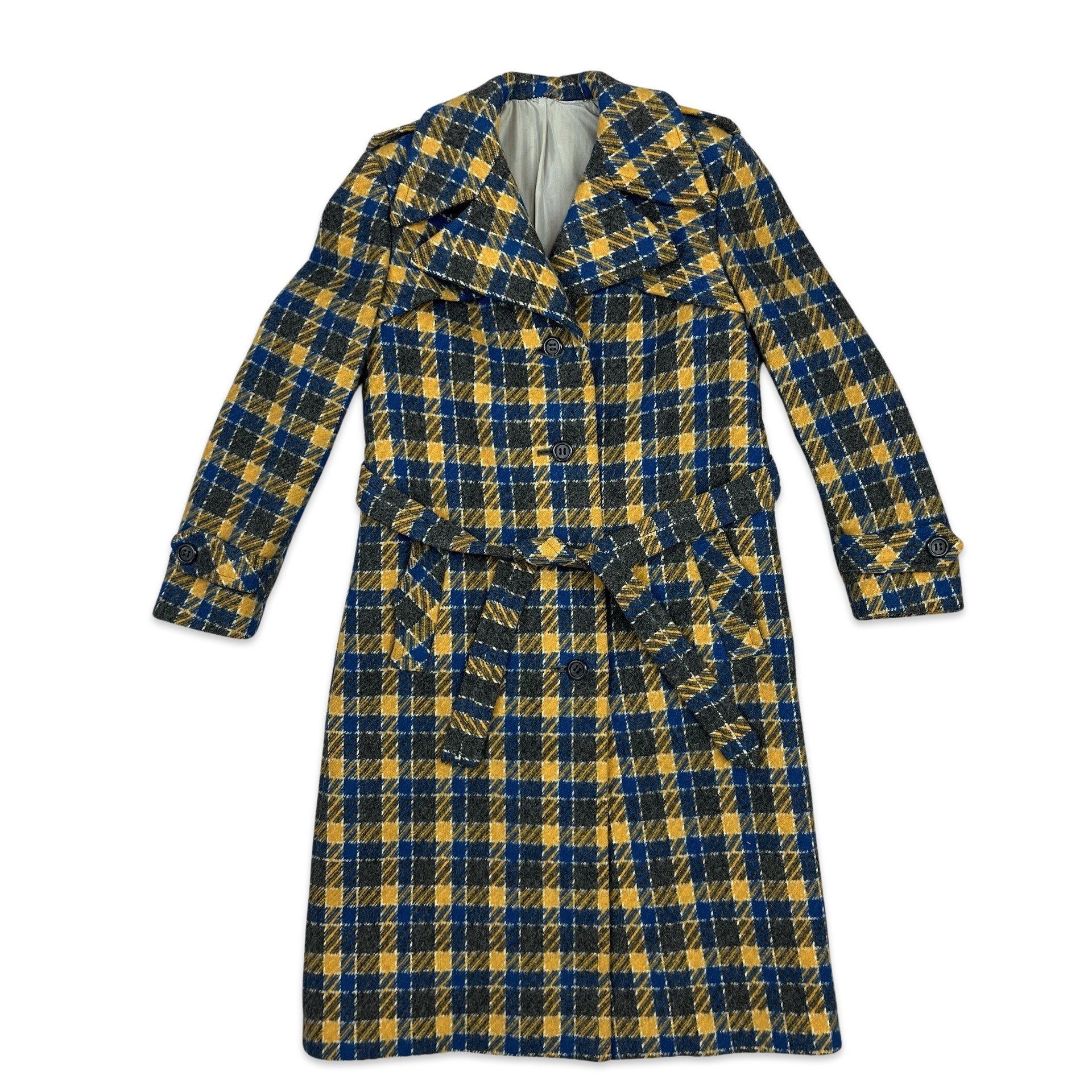 Vintage 70s wool midi coat. Blue, mustard yellow and charcoal check tartan. Button front fastening, with original belt.
