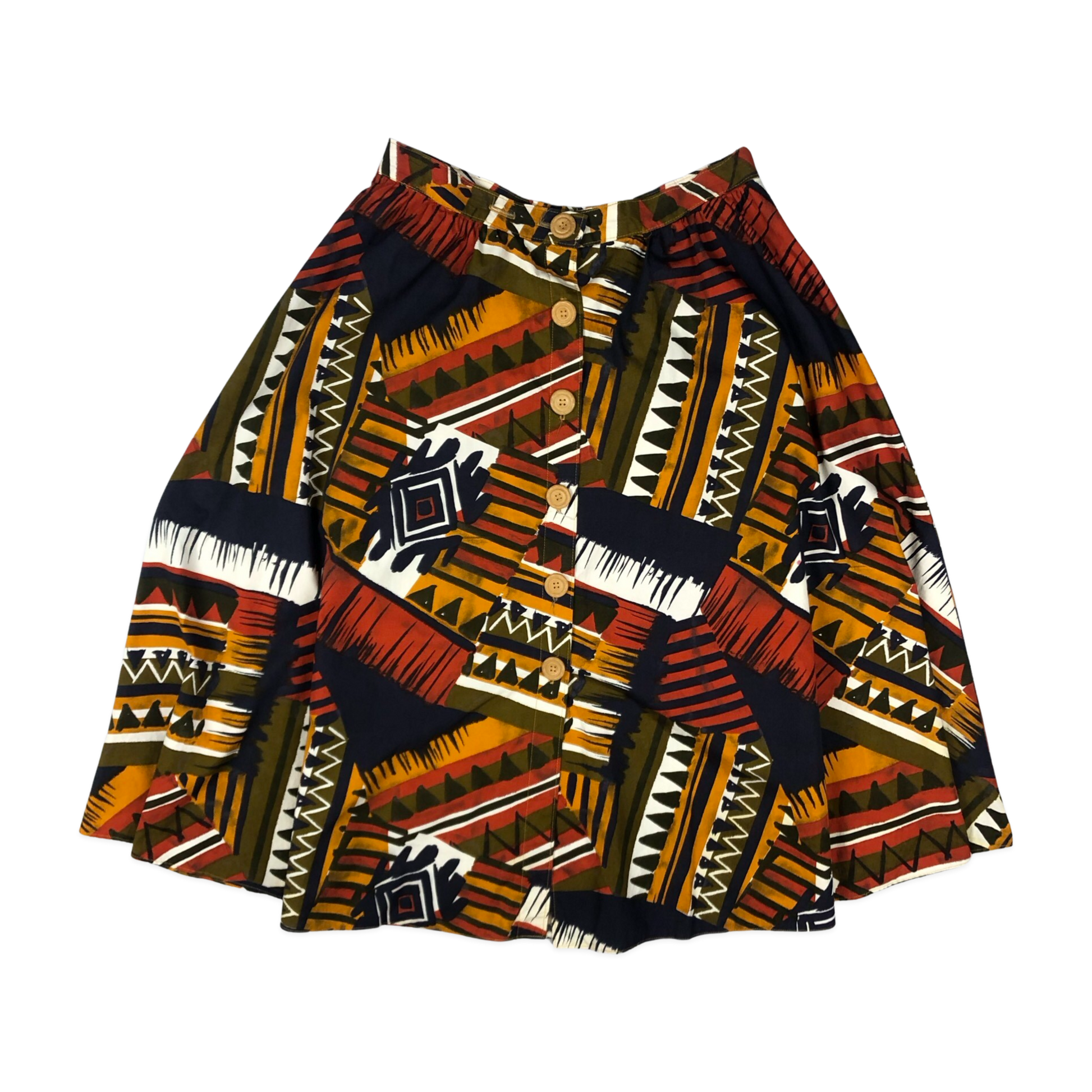 Vintage 80s 90s style gathered skirt with button-up front and abstract print. Features large wooden buttons.