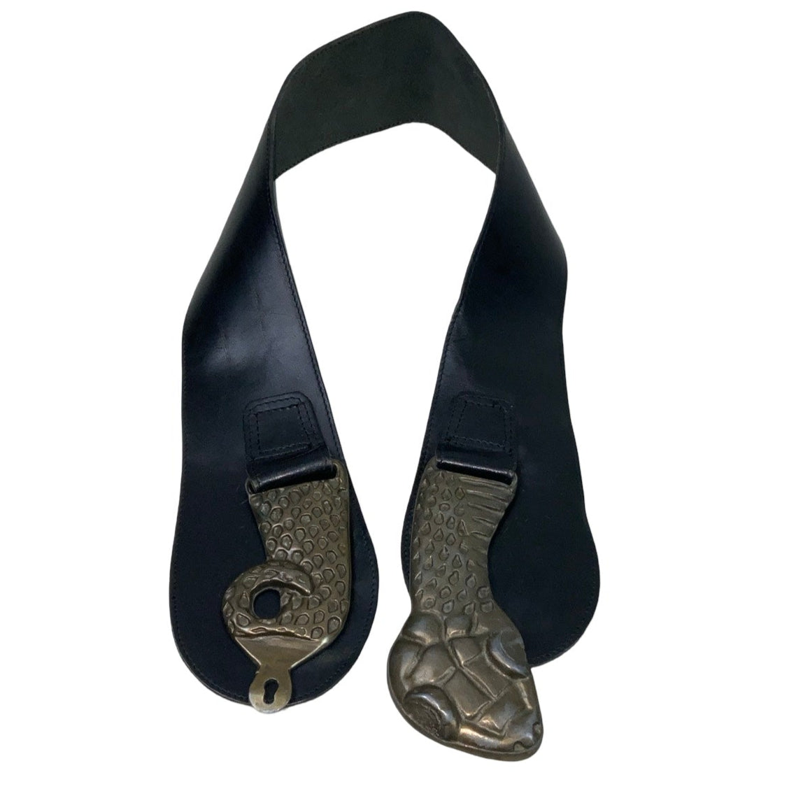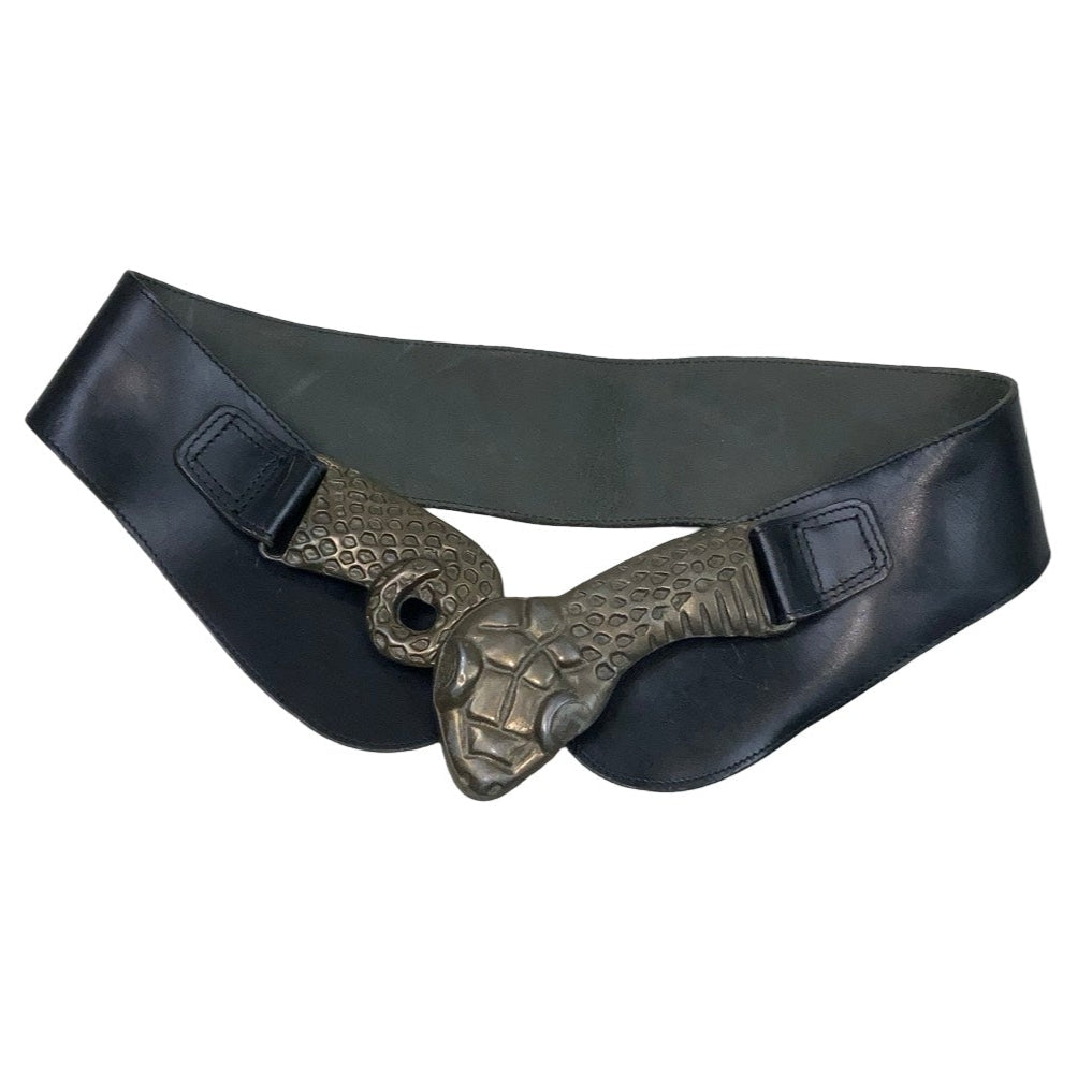 Vintage 1980s/90s black leather low waist belt with an ornate statement snake metal hook-and-eye buckle fastening.