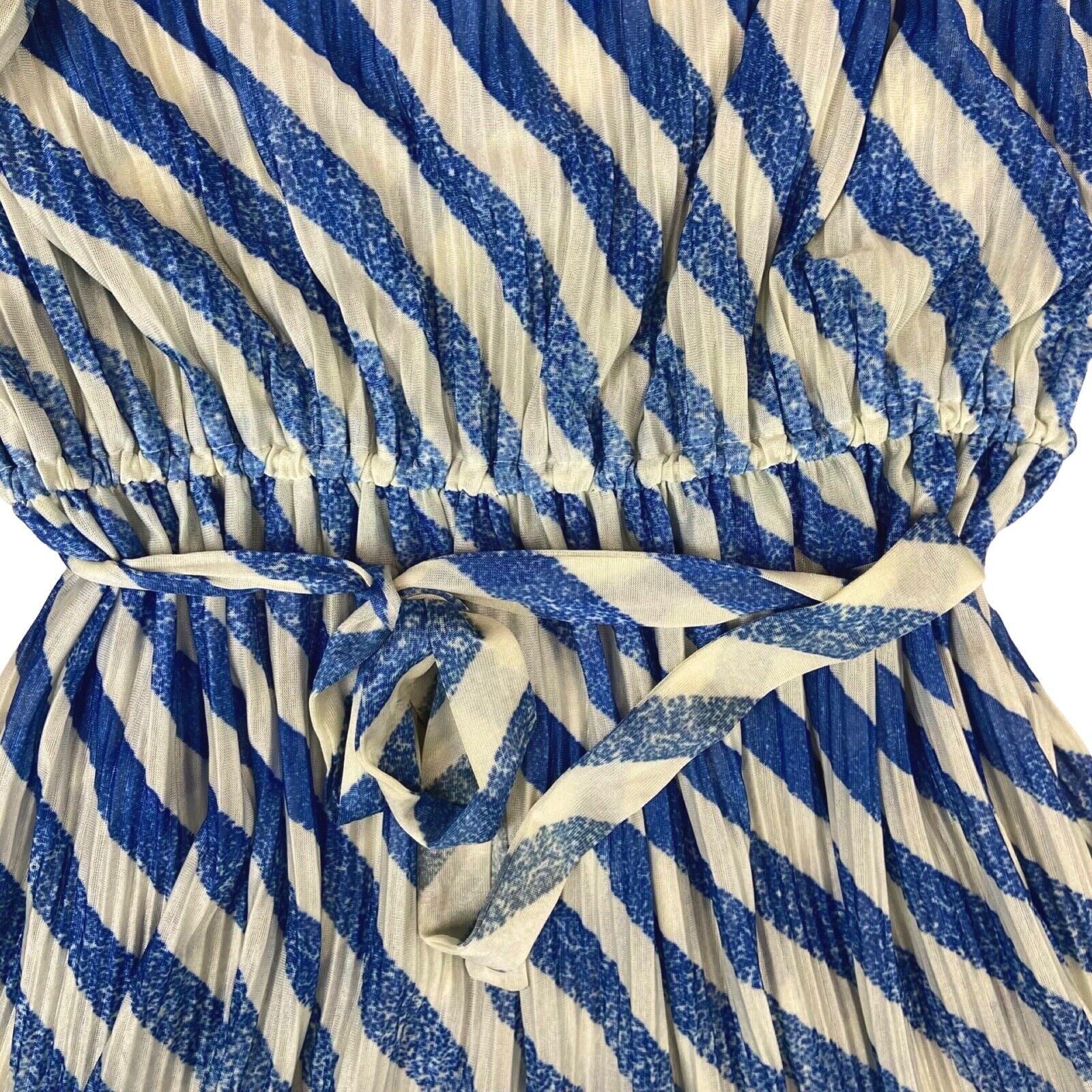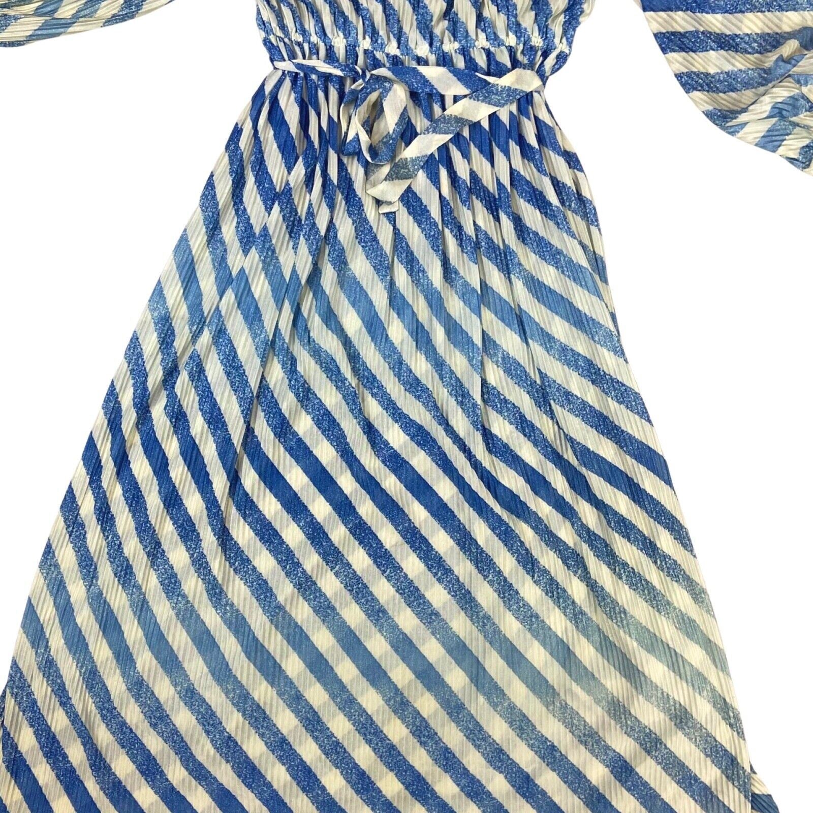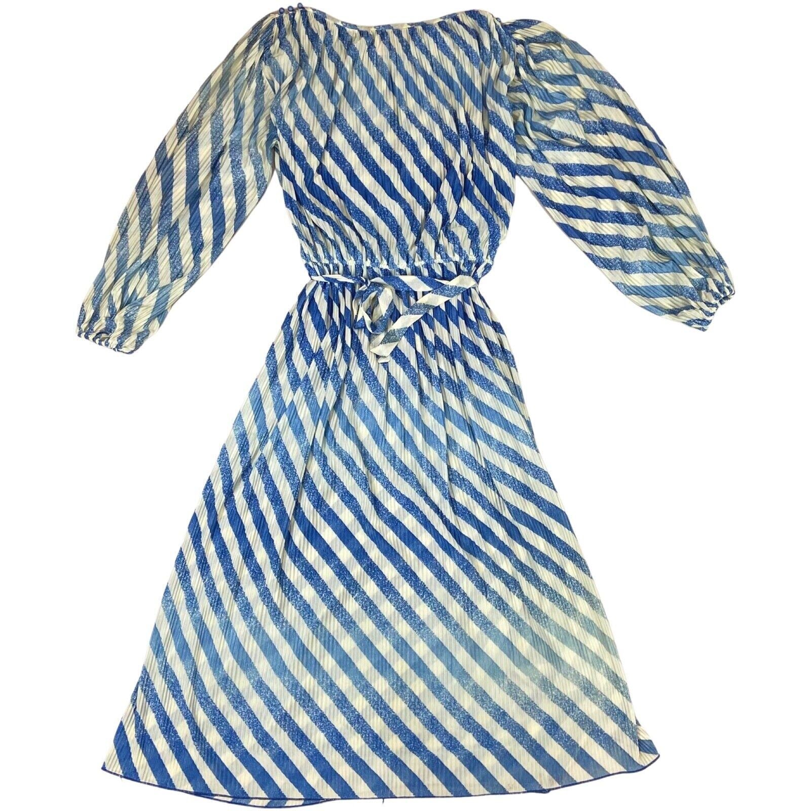 This is a blue pleated dress made from a blue striped tricel pleated dress with minimal stretch. Features include; a boat neckline, an elasticised waist, elasticated cuffs, long loose sleeves, mid length, an all over diagonal striped pattern, a full pleated material and a tie belt.