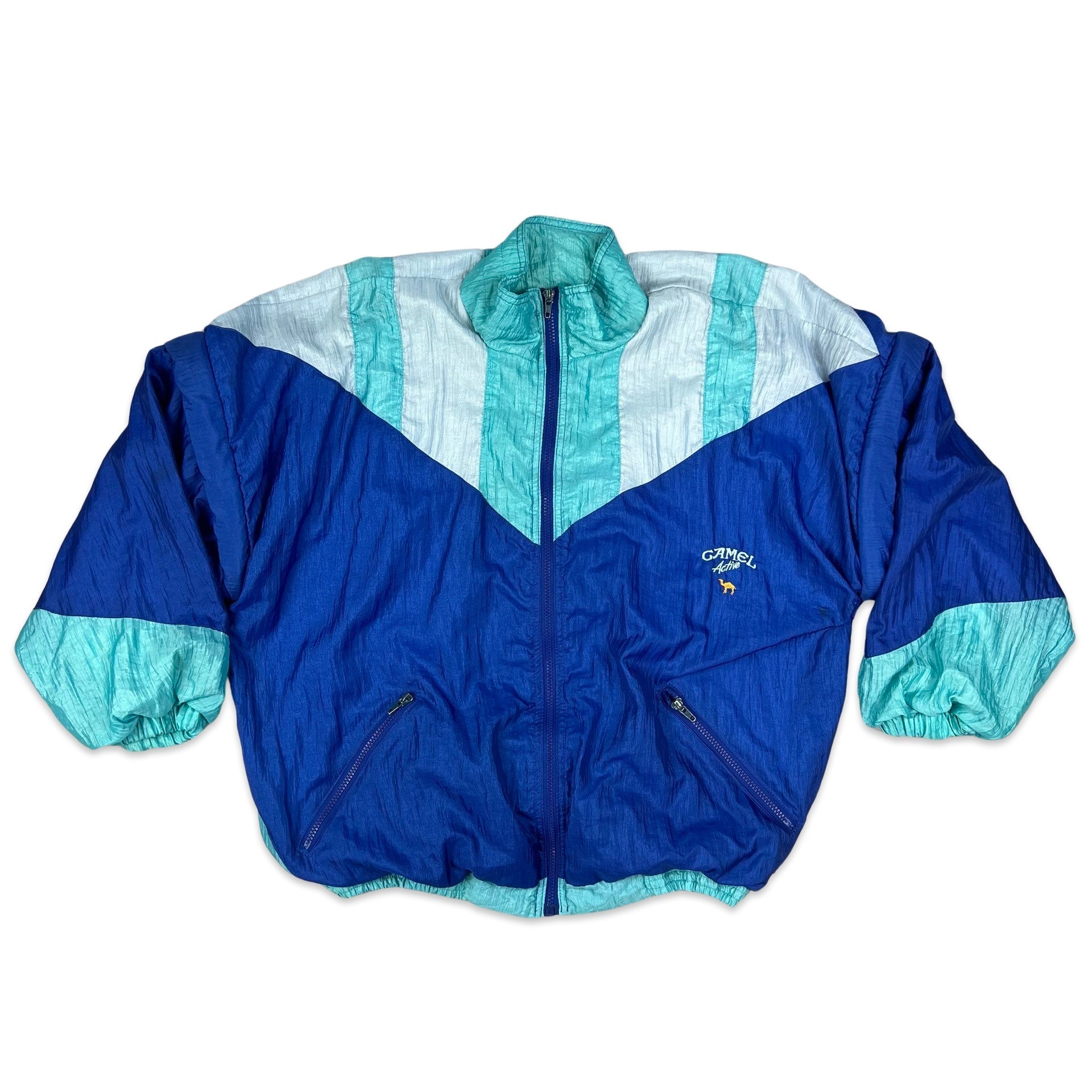 Vintage 80s / 90s Camel Active oversized shell jacket in shades of blue with colour block design. Interior cloth lining and embroidered logo on chest.