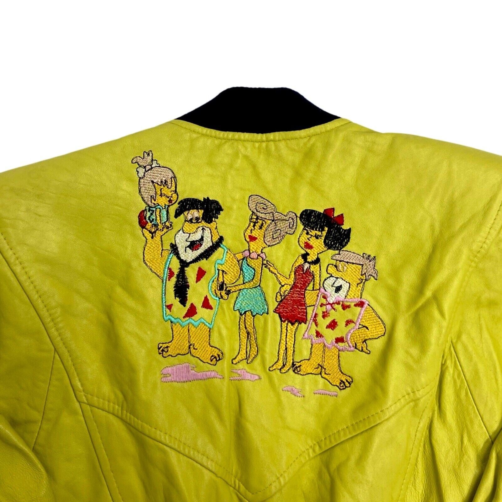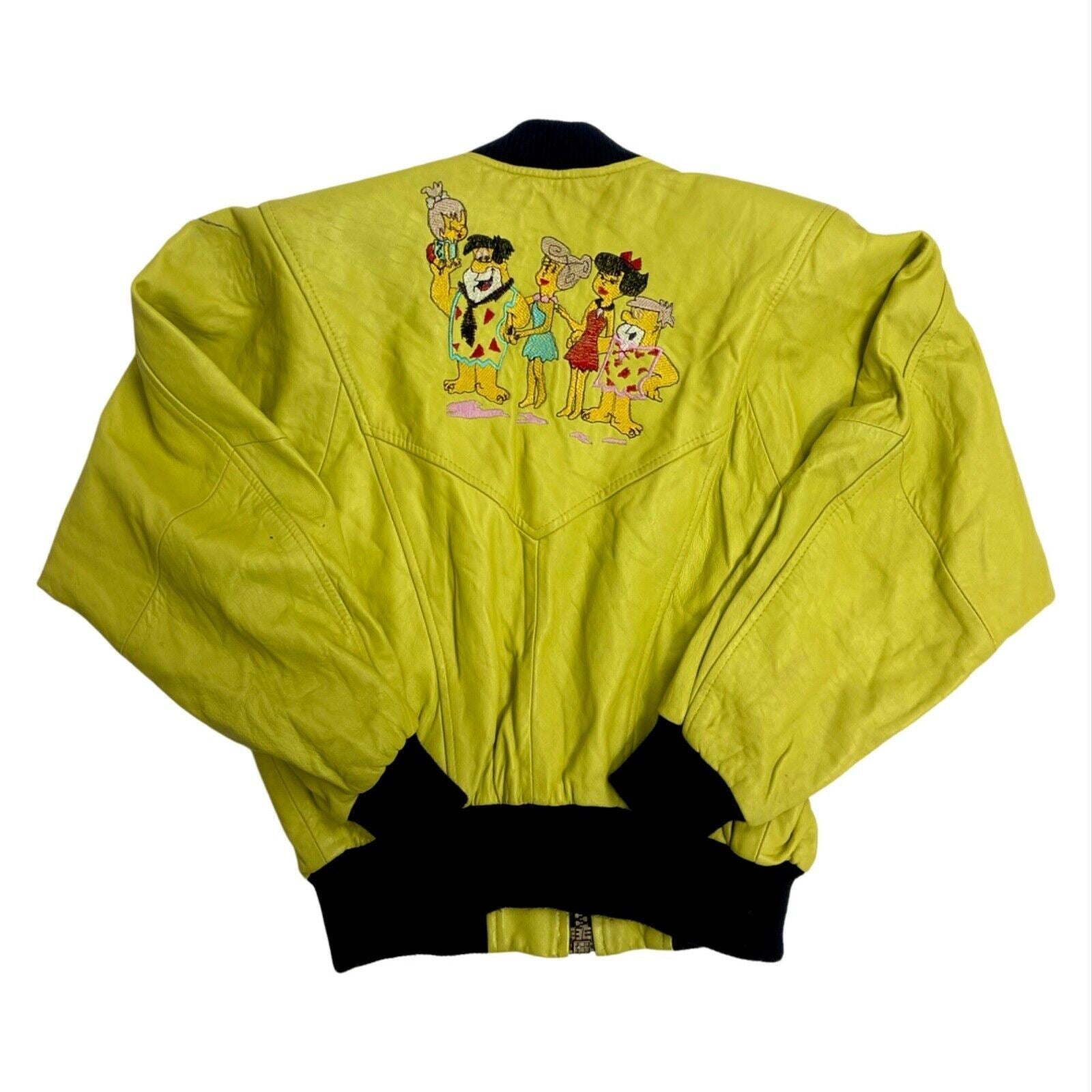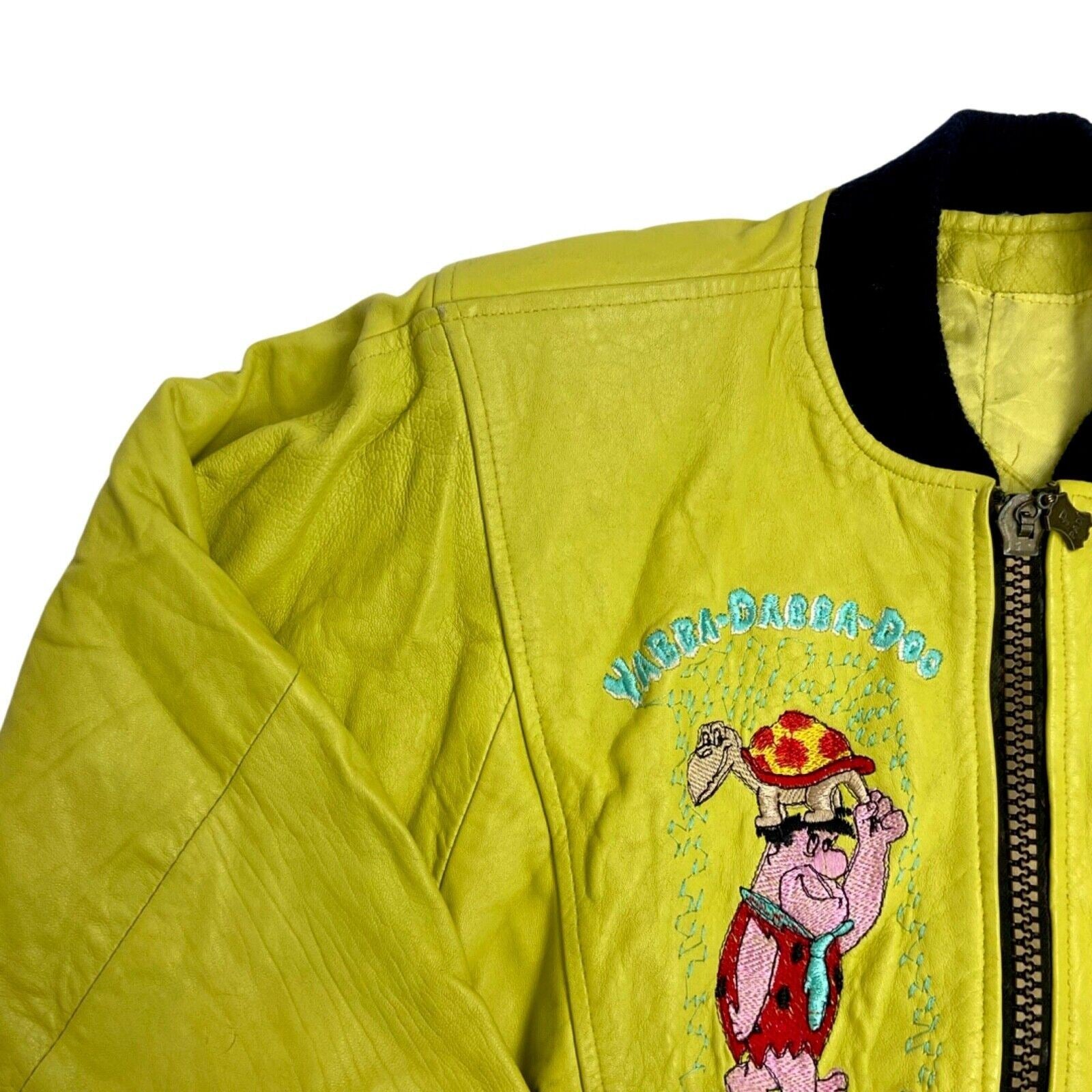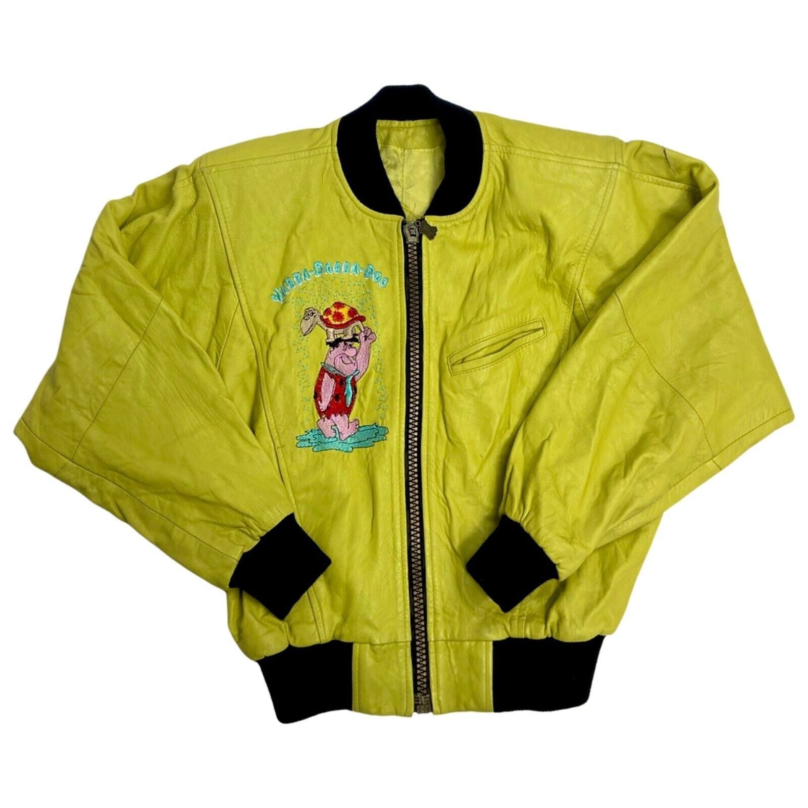 Vintage 80s 90s Green Leather Flintstones Embroidered Bomber Jacket S