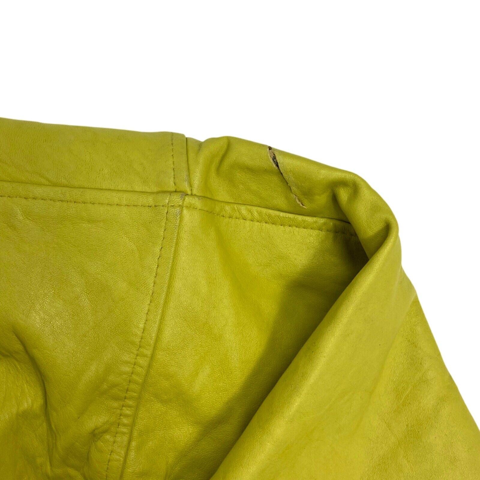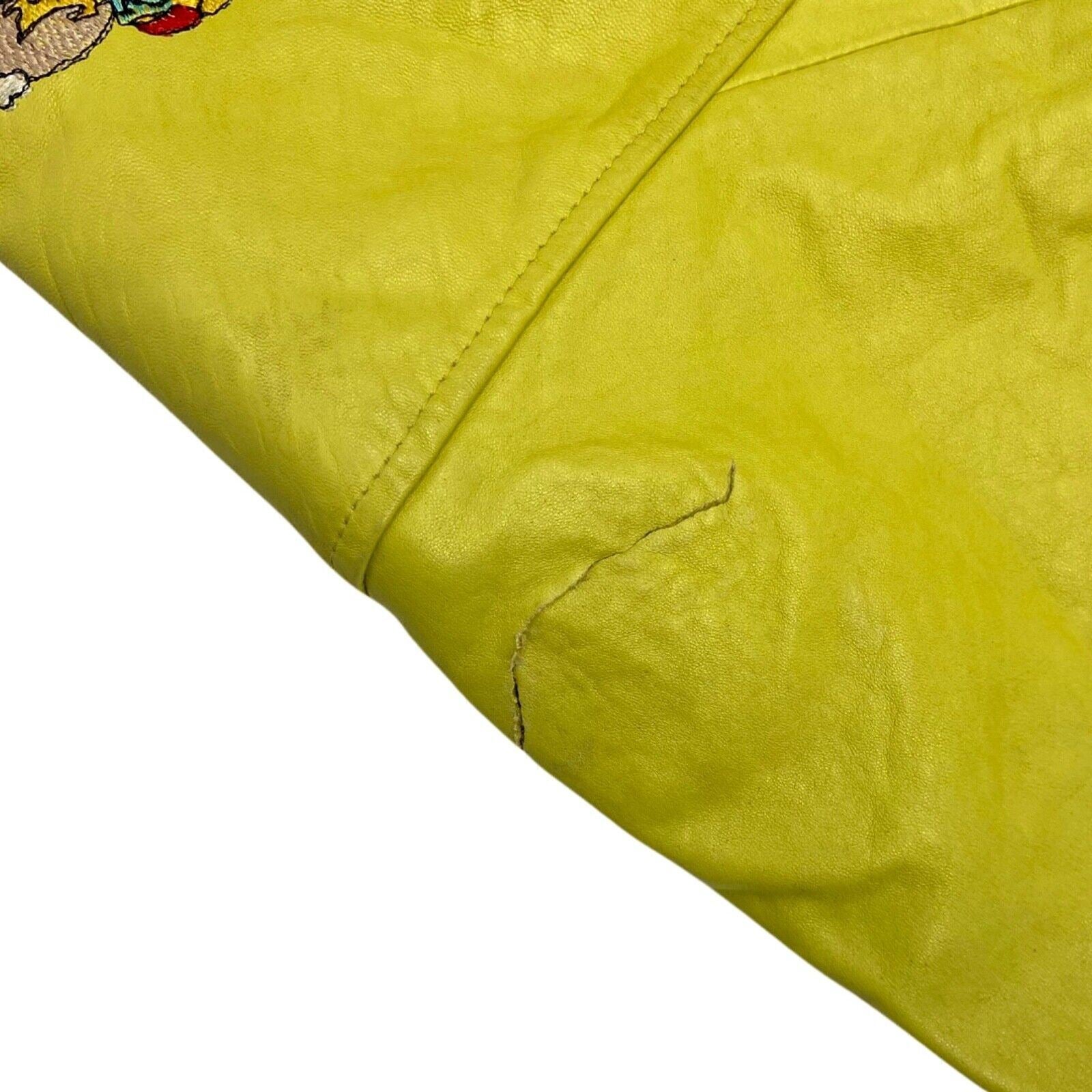 This is a unique lime green, Flintstones leather bomber jacket. There is black stretchy ribbing along the collar, cuffs and bottom hem. This piece is made from leather with a polyester lining and slight padding in the shoulders. There is a fun Flintstones embroidery on the front and back of this striking piece. The right arm has a slight rip in the fabric (pictured).