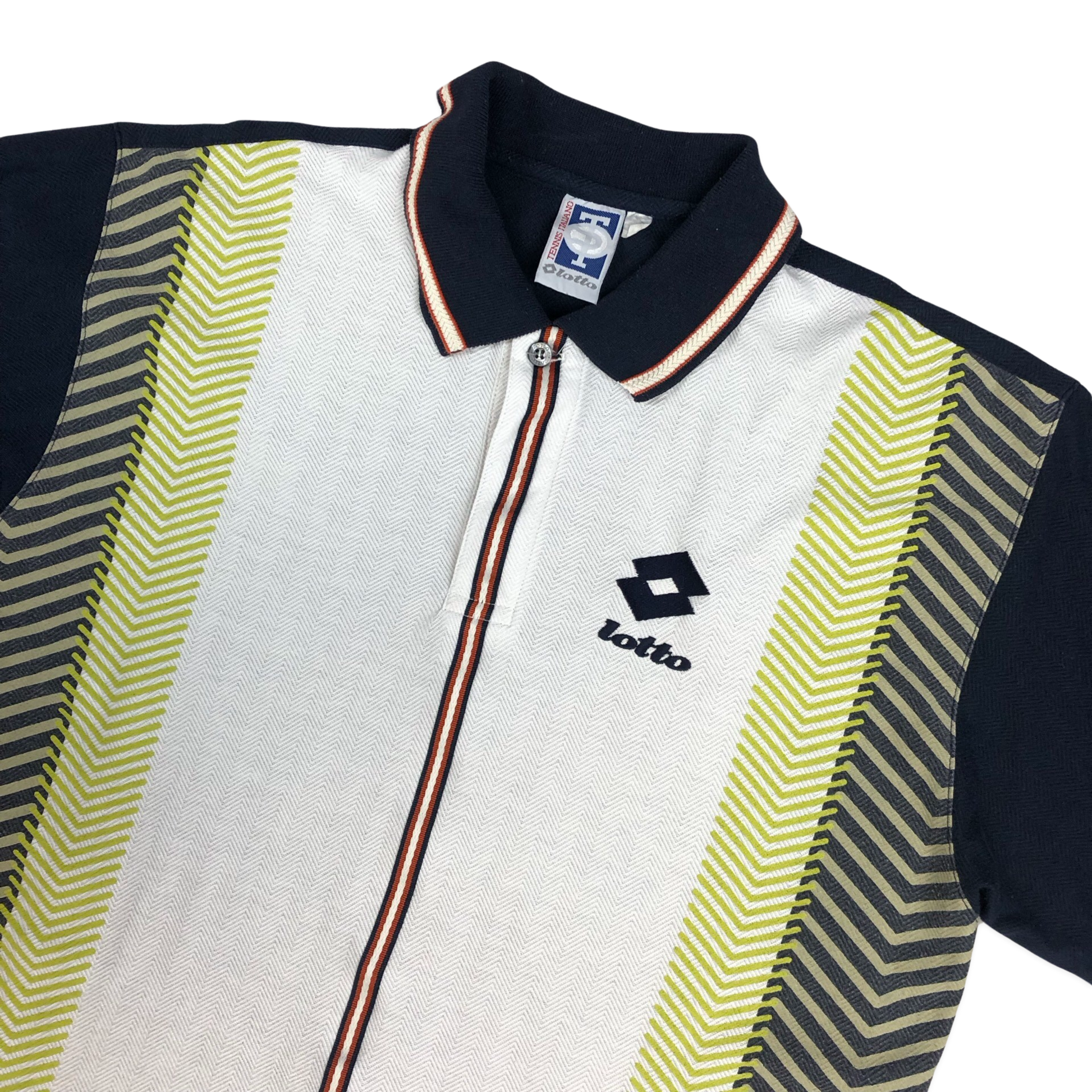 Vintage 80s 90s Lotto polo shirt in white, navy, and green with chest embroidered logo.