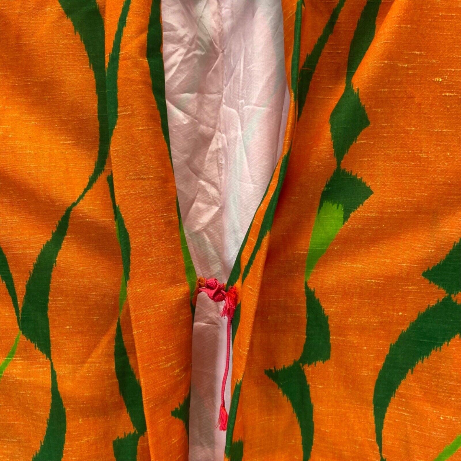 This is a gorgeous Haori Komon Kimono made from an orange and green woven fabric with minimal stretch and a synthetic lining. Features include; an orange fabric with green patterns, a mid length finish and a pink tie in the centre.