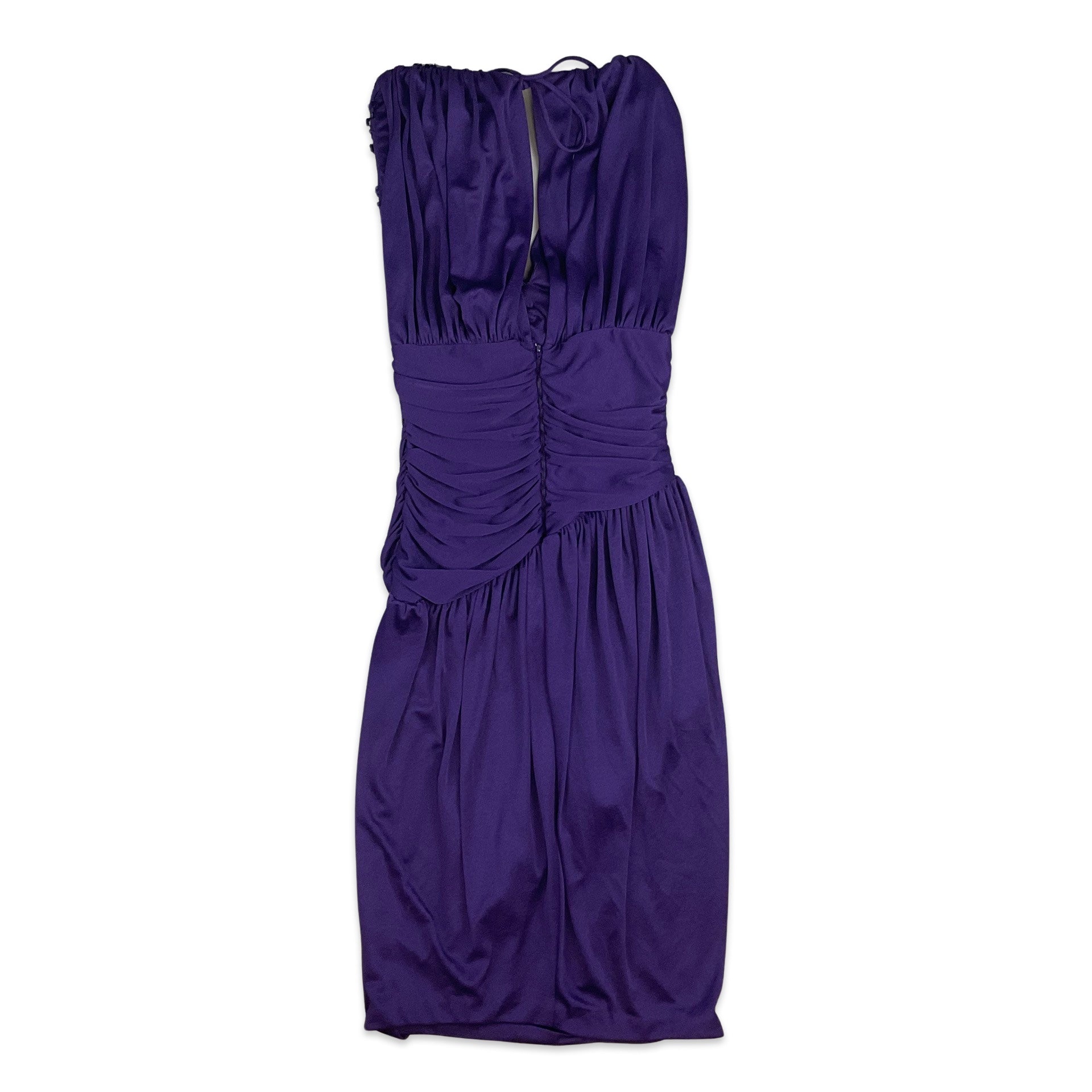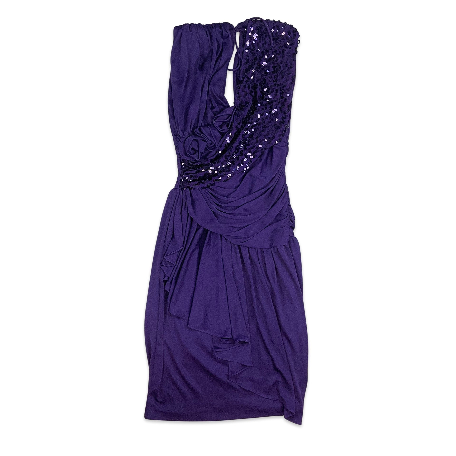 Vintage Y2K bias cut purple dress with sequin detailing. Rose appliqué detailing. Ruched material on the bodice. Low neck, open back, adjustable halter neck tie, zip closer. Asymmetric, layered silhouette.