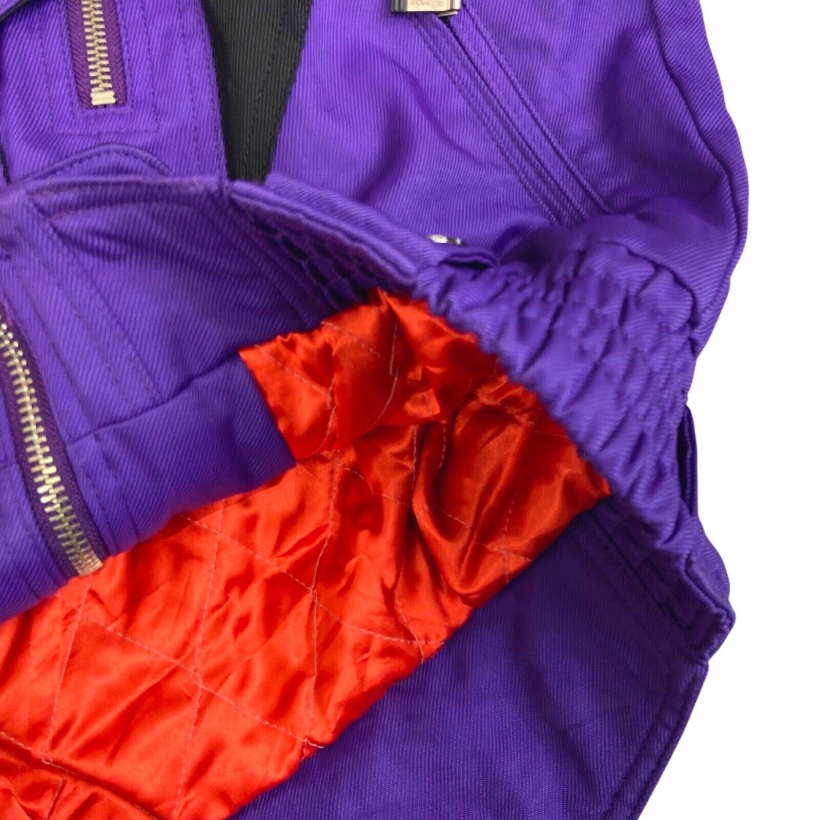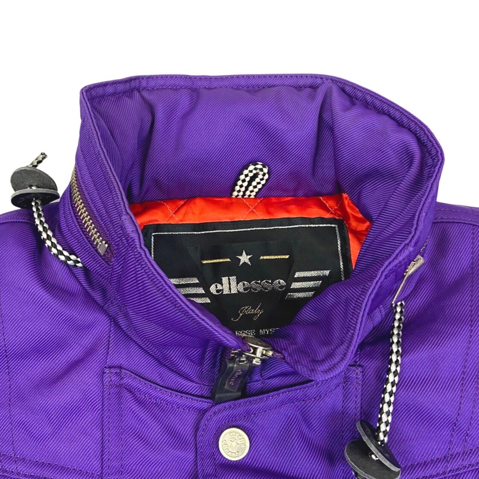 This is a cool purple Ellesse ski jacket. The outer shell is made from a nylon fabric with minimal stretch and there is an orange polyester lining. This coat has a high neck with a zip away hood. There is a concealed zip down the front with embossed buttons down the centre. The hem and cuffs are both elasticated. The front of this jacket has 4 zip close pockets. Each arm has an embroidered Ellesse patch. This coat has a classic 80s ski jacket feel with an almost batwing sleeve and a tapered hem.