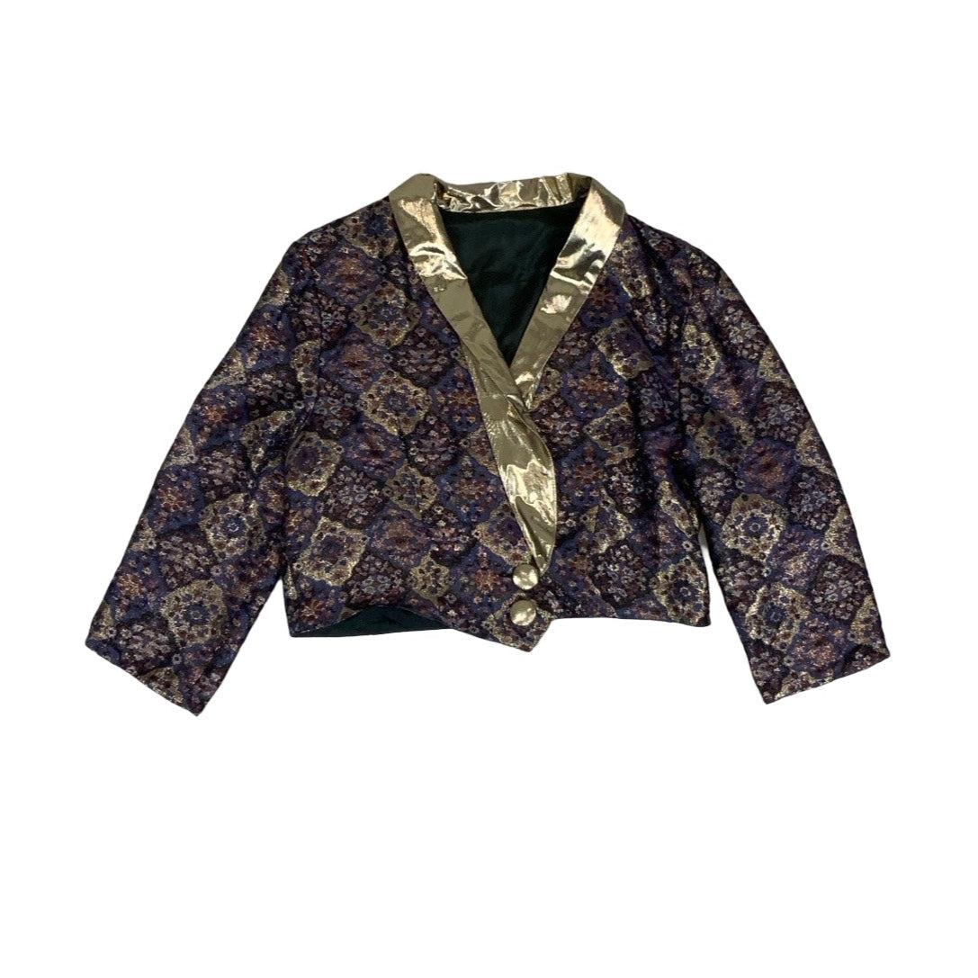 Vintage 1980s/90s cropped blouse in a dark purple, geometric patterned fabric with a gold trim. Faux button detail at the front, V neckline and 3/4 sleeves.