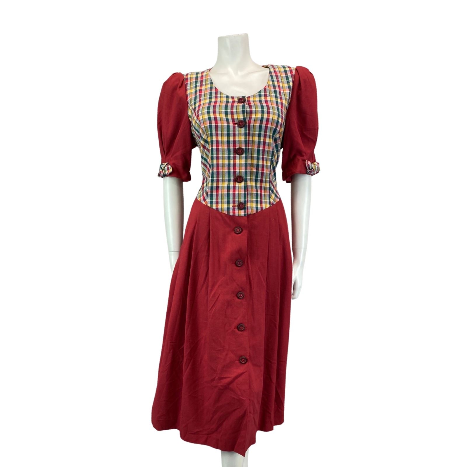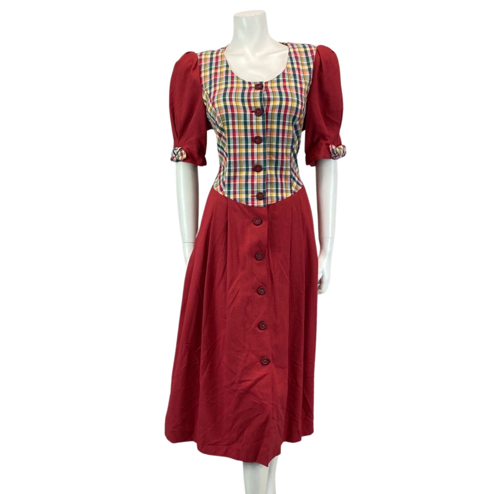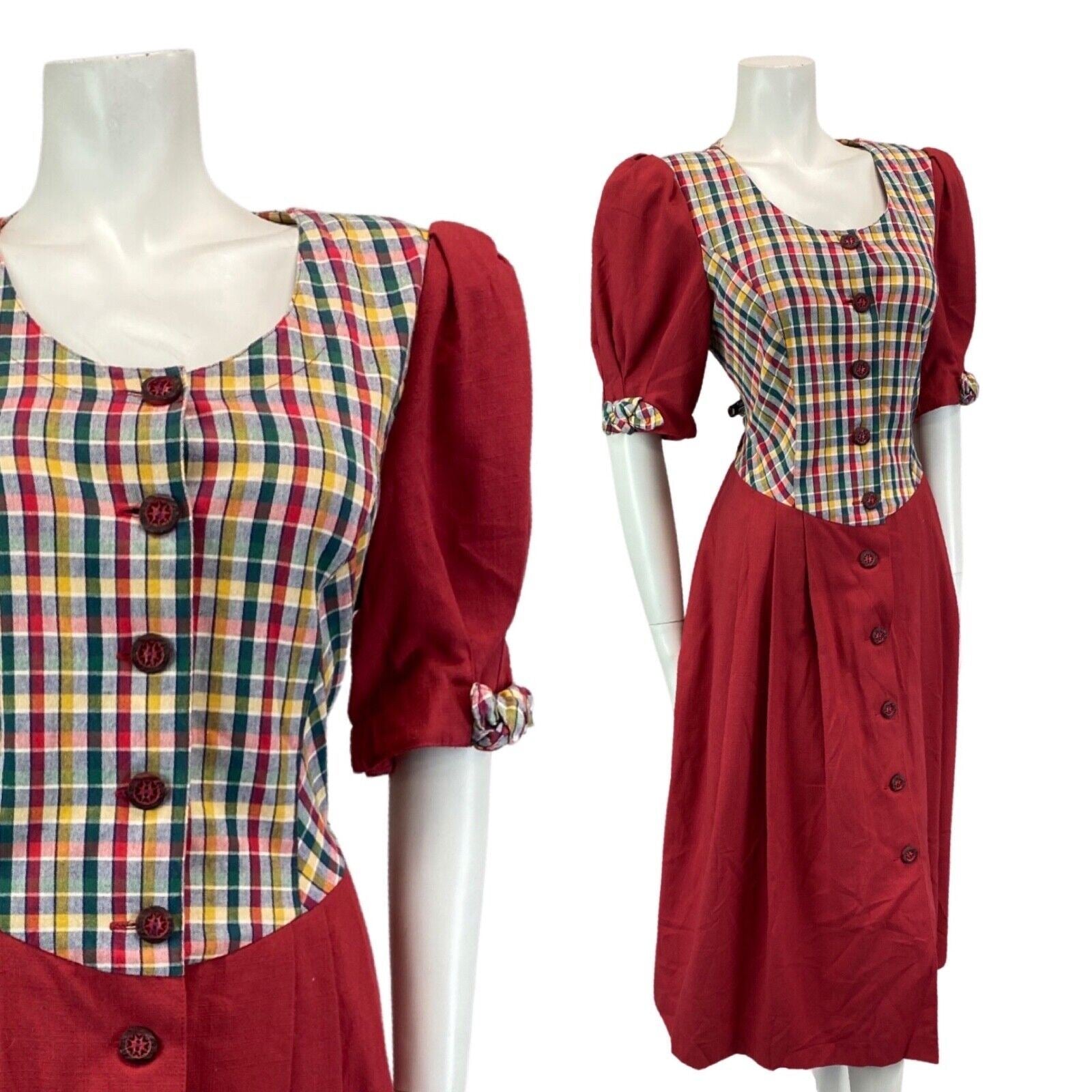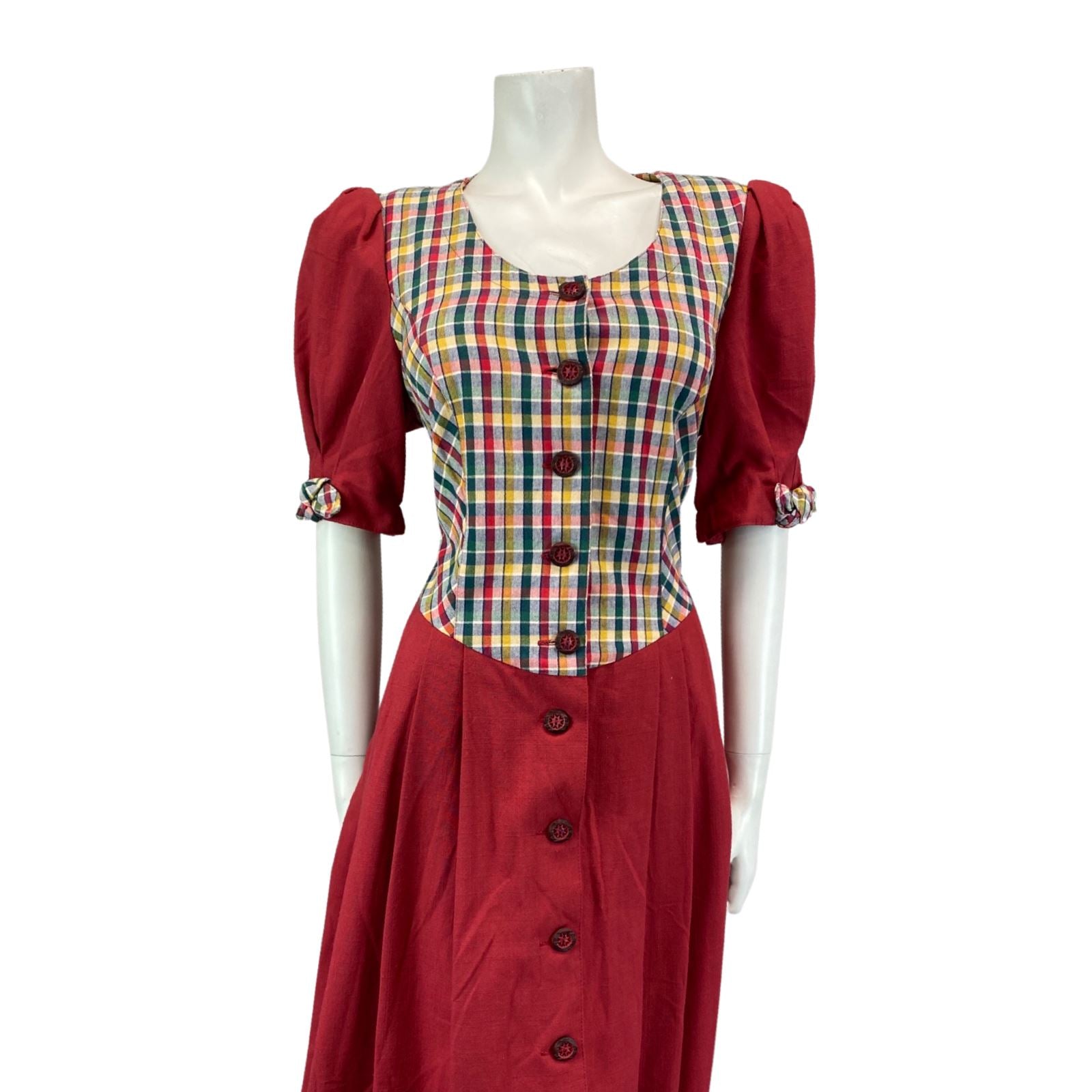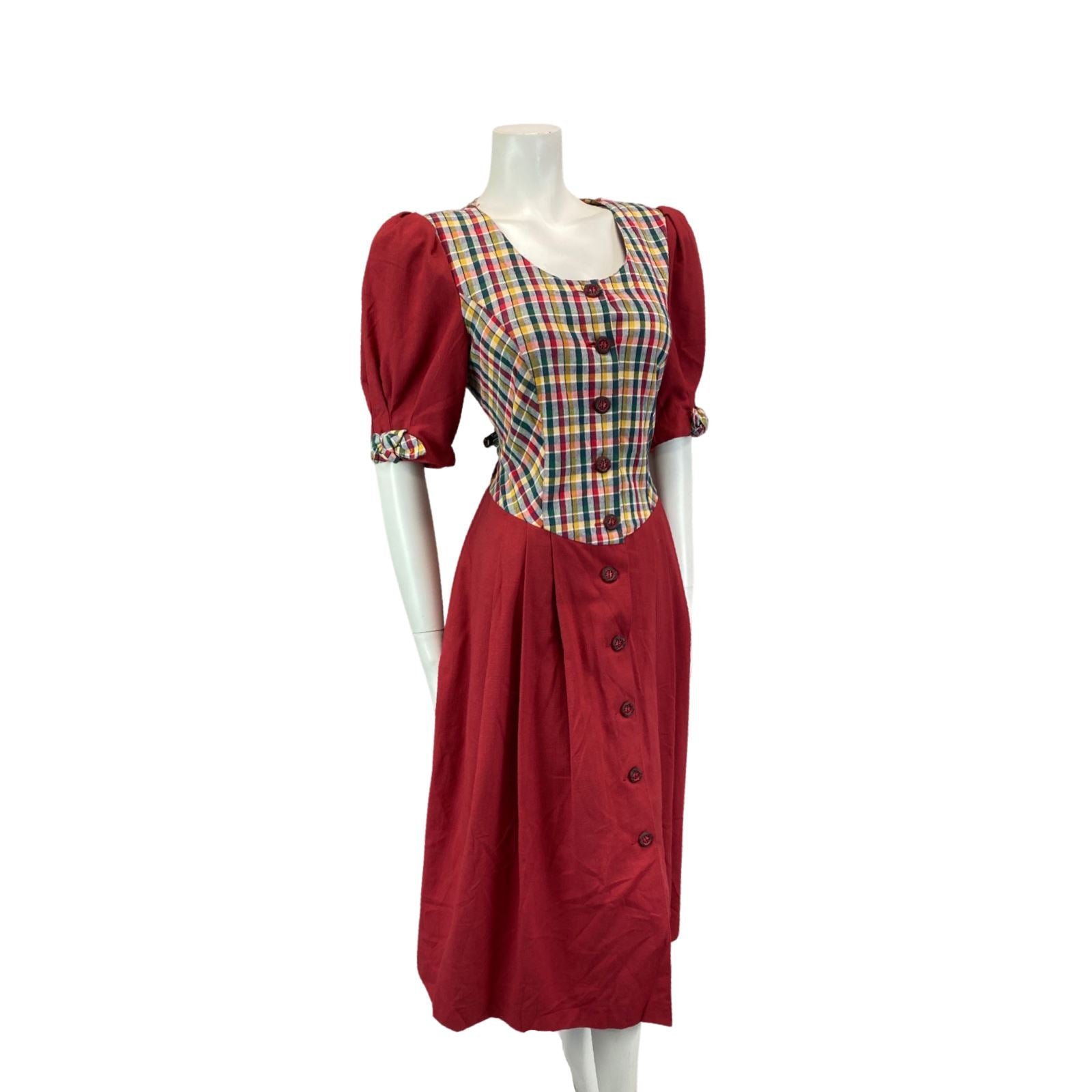 Vintage 80s 90s Red Authentic Tyrolean Dirndl Short Sleeve Check Midi Dress M/L