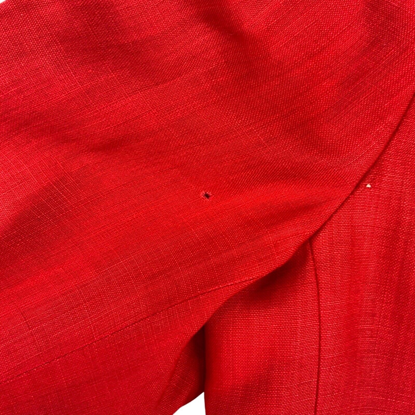 This is a stunning red Valentino Blazer, made from a flax linen material, and a polyester lining. With slight padding in the shoulders. Has minimal stretch to it so please make sure that you've read the measurements before purchase.