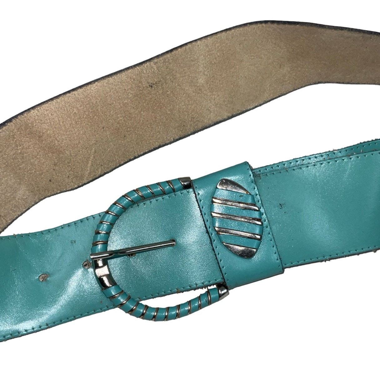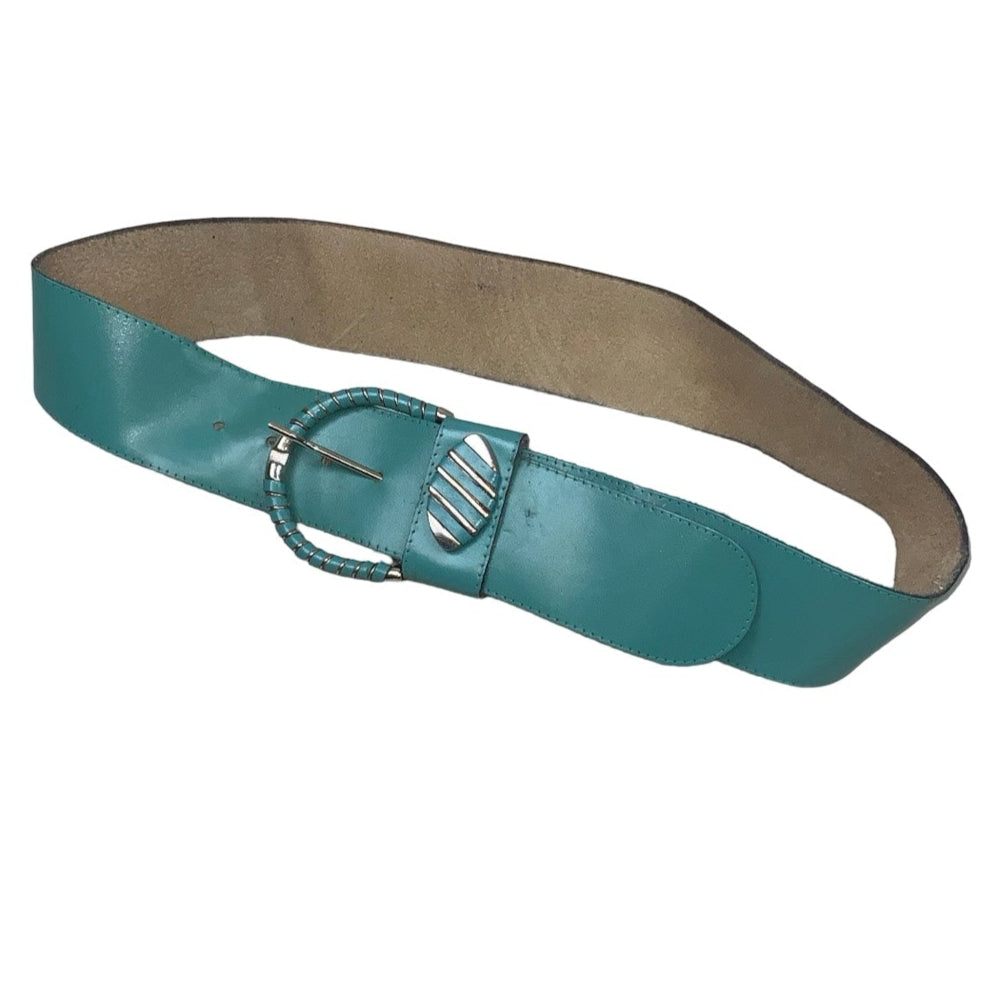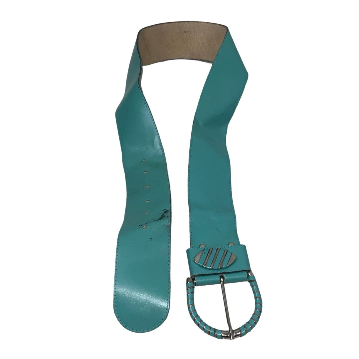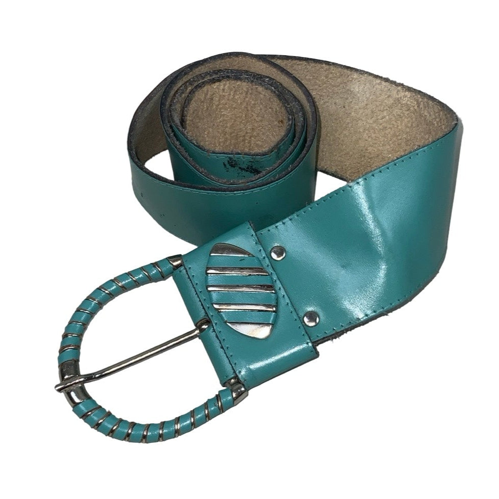 Vintage 80s 90s Retro Teal Green Glossy Leather Silver Buckle Belt