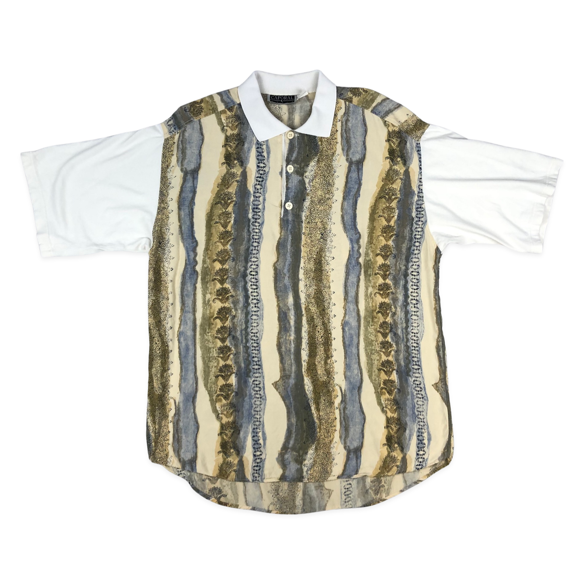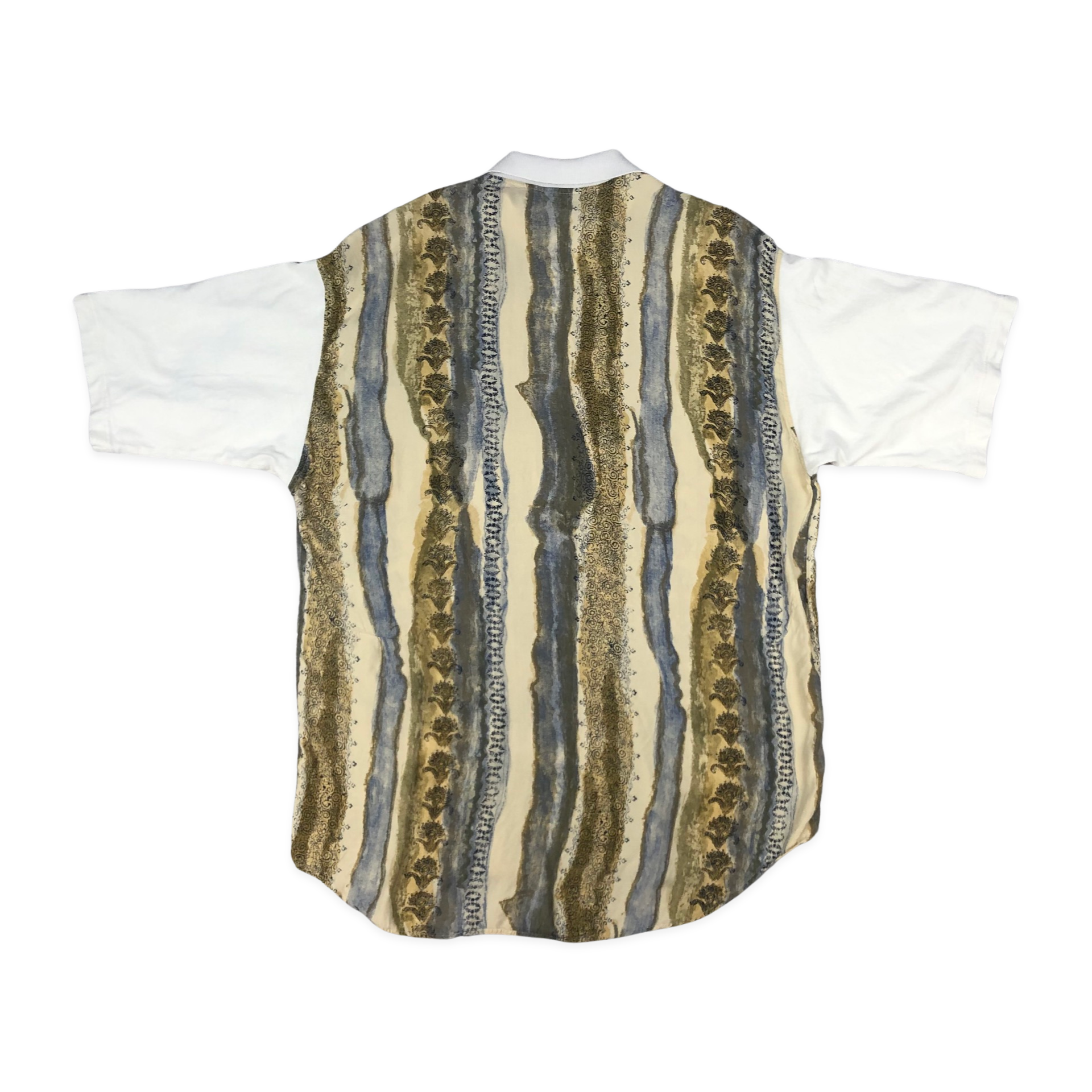 Vintage 80s French-made abstract print polo shirt with white sleeves and collar. 100% viscose.