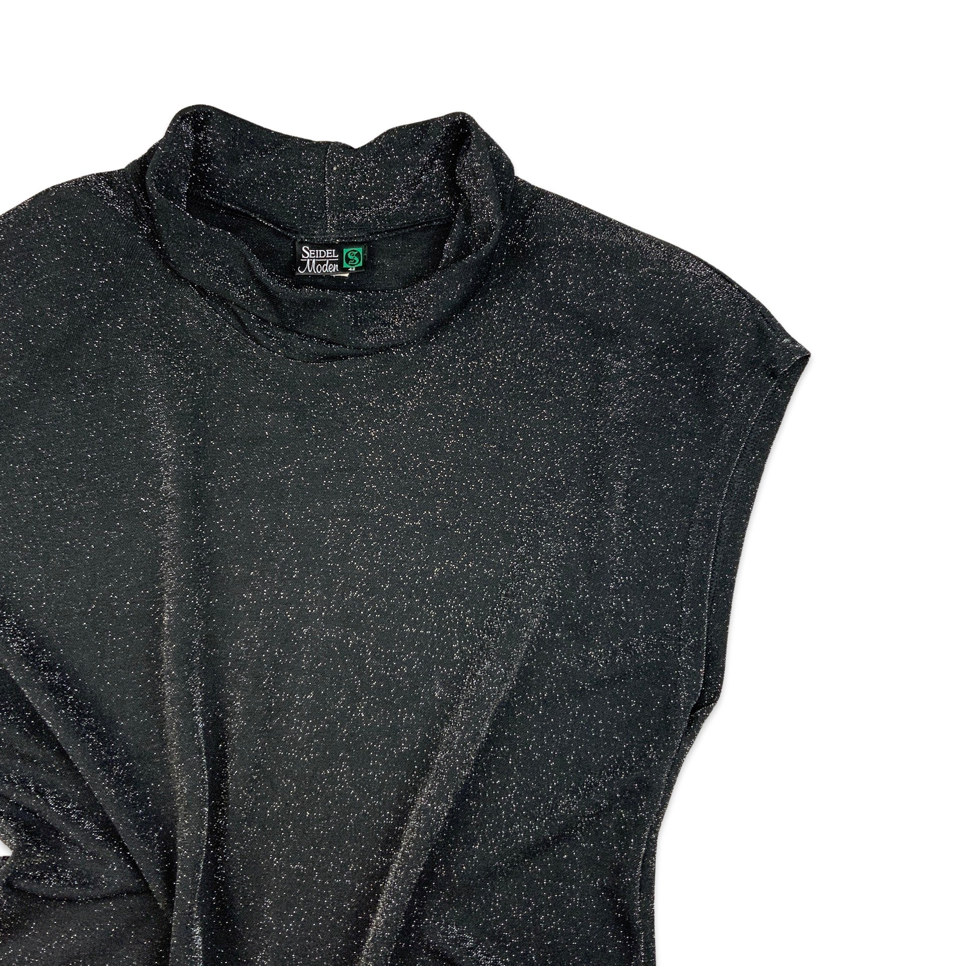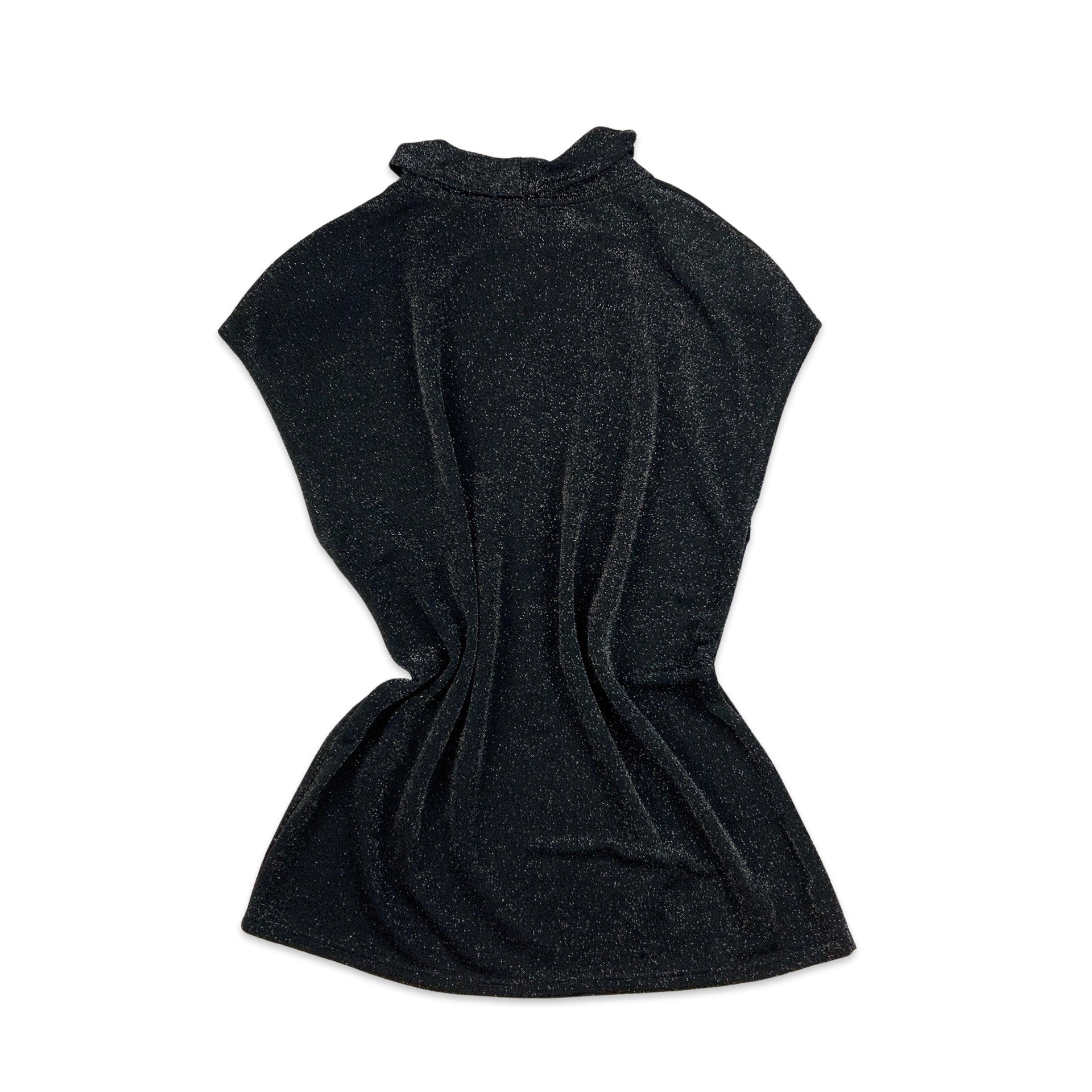 Vintage black and silver sleeveless blouse with collar detail.