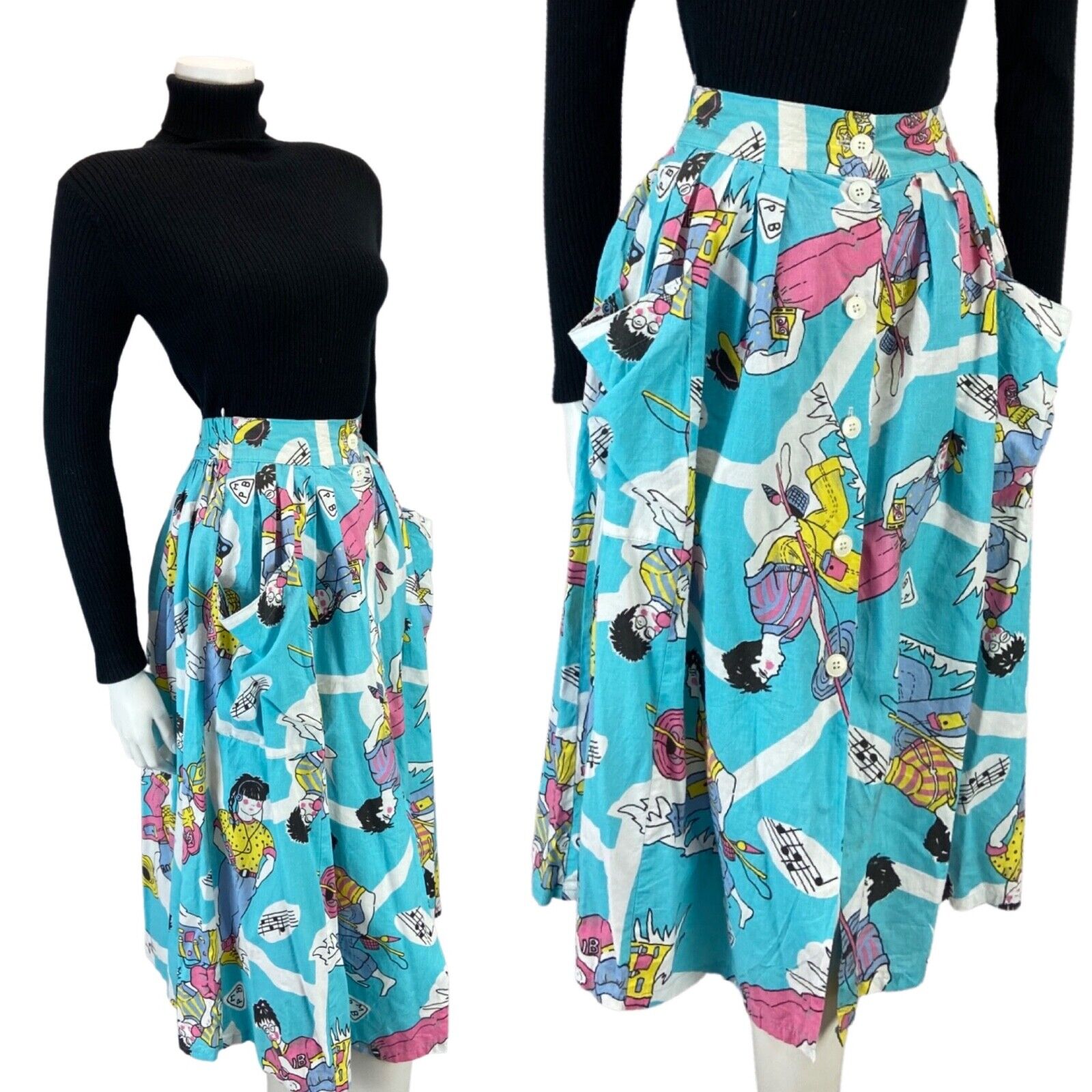 VINTAGE 80S BLUE GRAPHIC PRINT BOLD CARTOON SWING BUTTON DOWN MIDI SKIRT