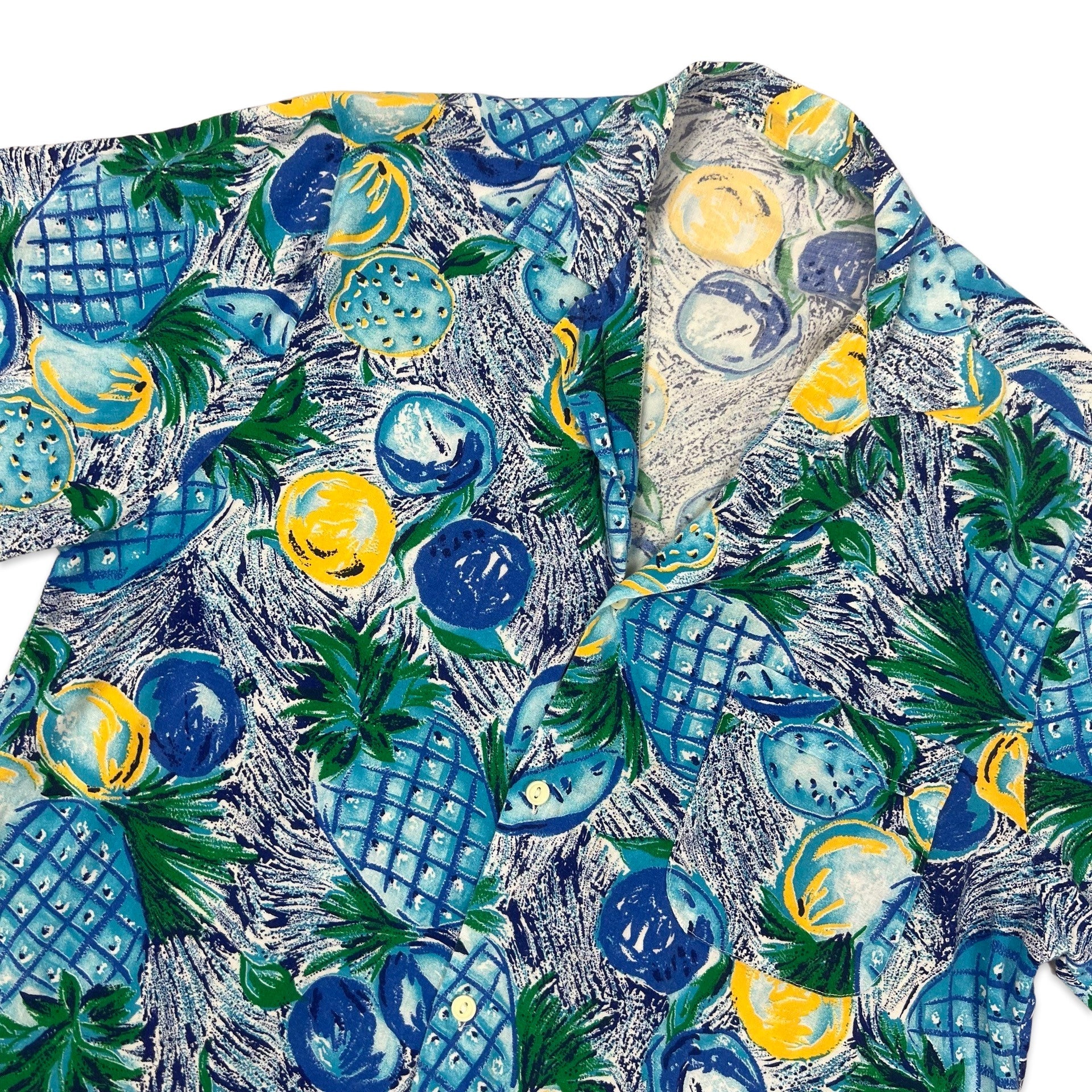 Vintage 80s Blue Pineapple Print Hawaiian Shirt M L