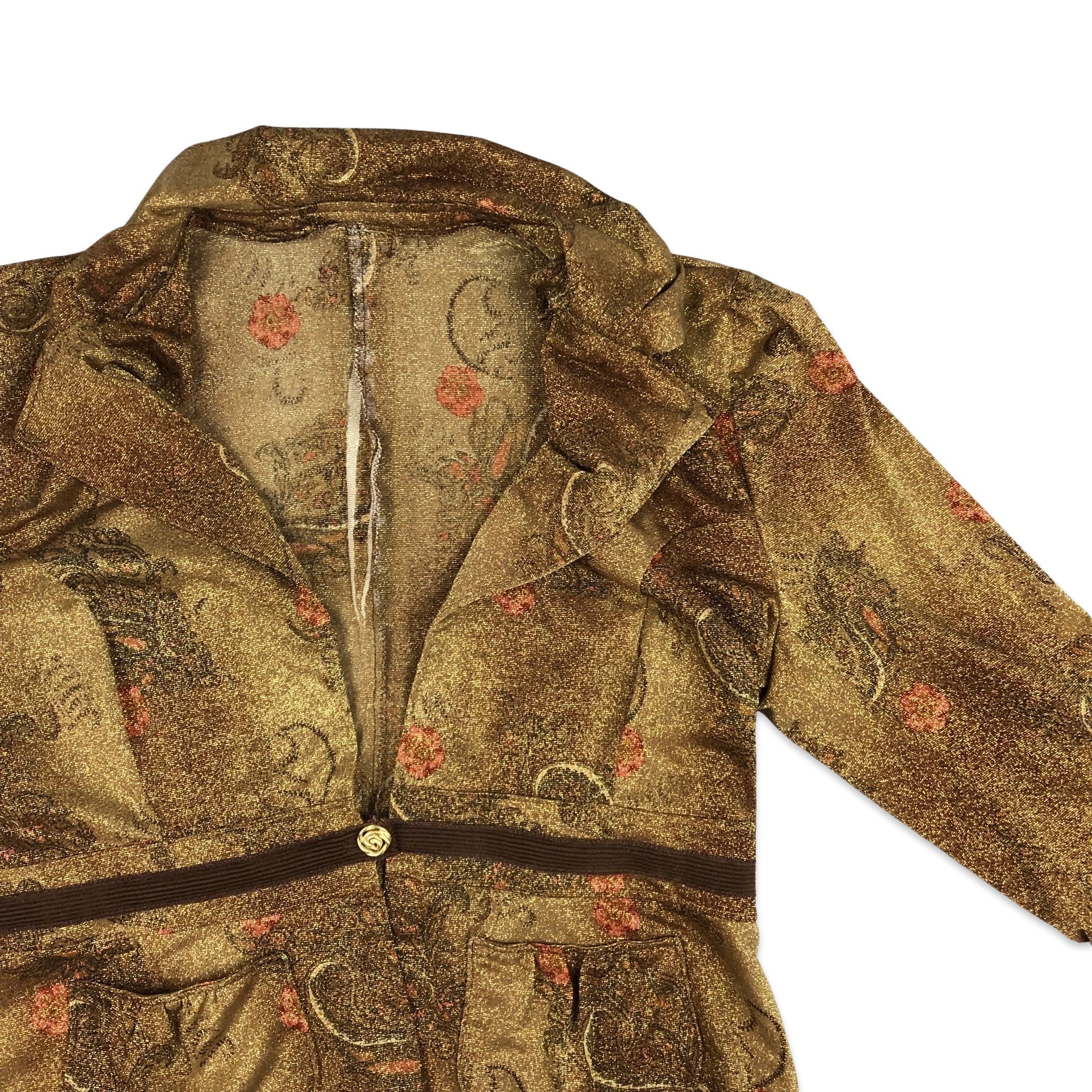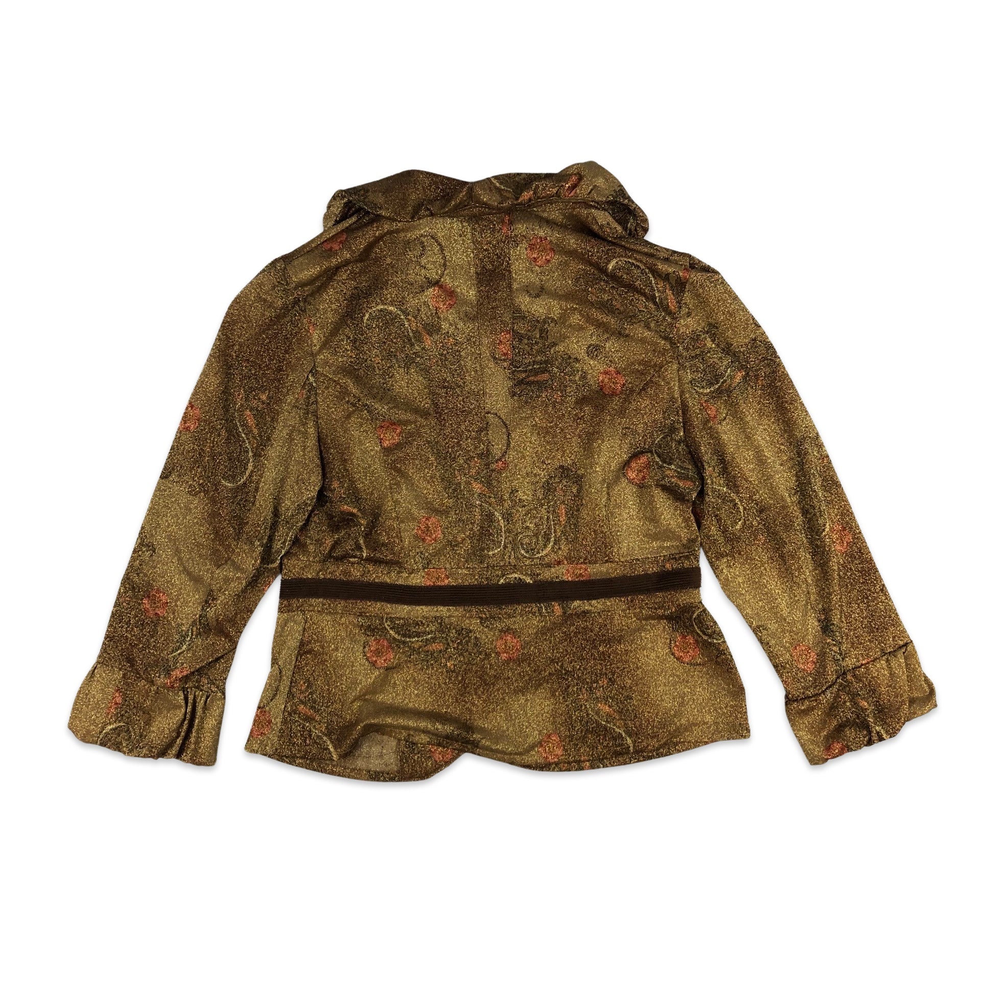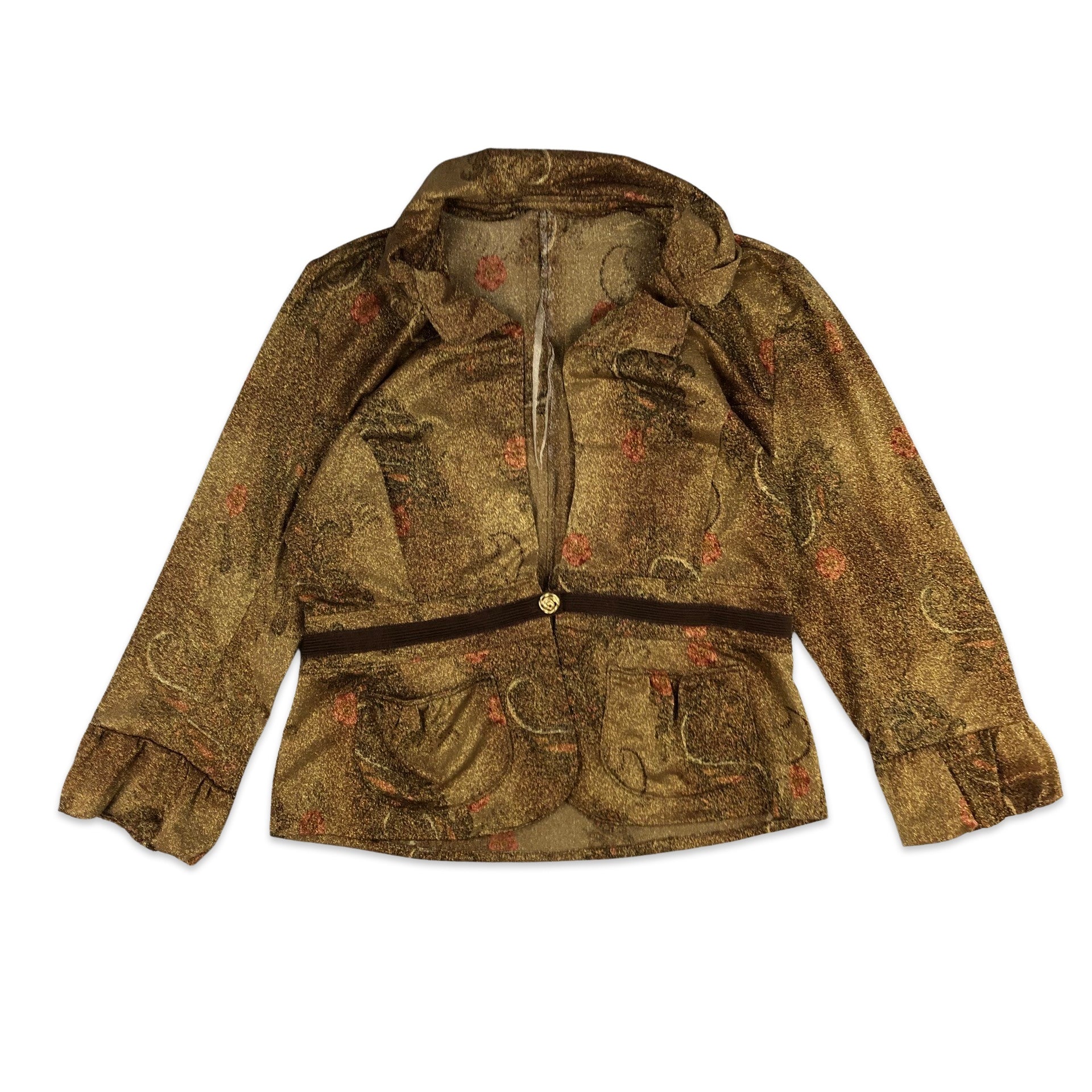 Vintage 80s brown and gold lurex blazer with single button opening. Pocket and frilled cuffs detailing.